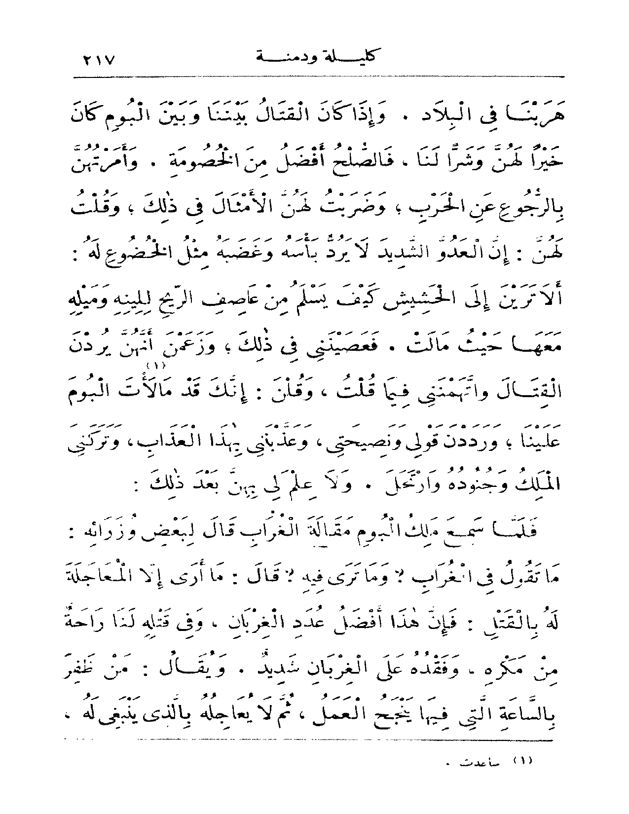 هربنا في البلاد وإذا كان القتال بيننا وبين البوم كان خيراً لهنّ وشراً لنا، فالصلح أفضل من الخصومة وأمرتهنَّ بالرجوع عن الحرب، وضربت لهن الأمثال في ذلك، وقلت لهن: إن العدوّ الشديد لا يرد بأسه وغضبه مثل الخضوع له: ألا ترين إلى الحشيش كيف يسلم من عاصف الريح للينه وميله معها حيث مالت فعصينني في ذلك وزعمن أنهن يردن القتال وأتهمنني في ما قلت، وقلنا إنك قد مالأت البوم علينا ورددنَ قولي ونصيحتي وعذبنني بهذا العذاب وتركني الملك وجنوده وأرتحل ولا علم لي بهن بعد ذلك: فلما سمع ملك البوم مقالة الغراب قال لبعض وزرائه: ما تقول في الغراب؟ وما ترى فيه؟ قال: ما أرى إلا المعاجلة له بالقتل: فإن هذا أفضل عُدَدِ الغربان، وفي قتله لنا راحة من مكره وفقده على الغربان شديد ويقال: من ظفر بالساعة التي فيها ينجح العمل ثم لا يعاجله بالذي ينبغي له