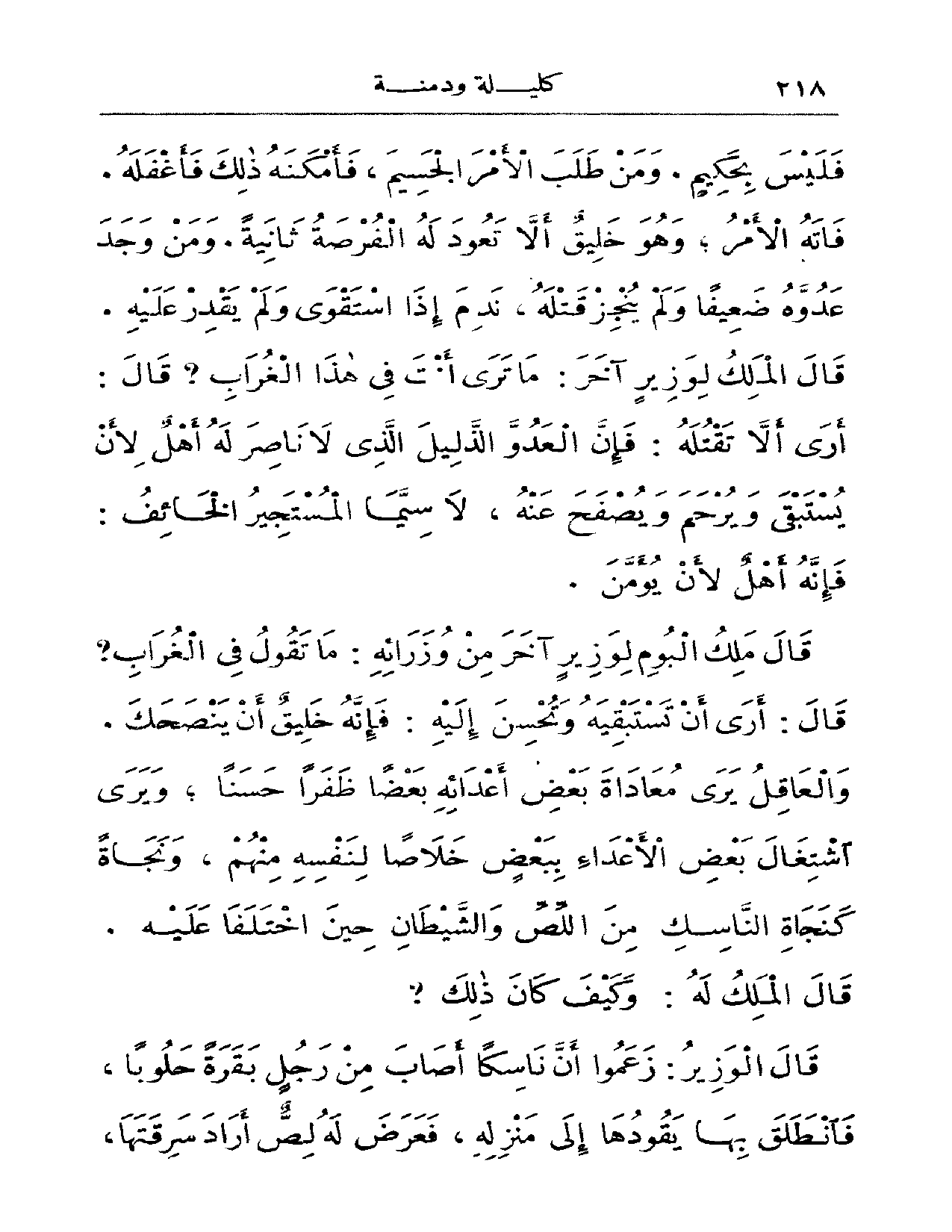 فليس بحكيم ومن طلب الأمر الجسيم فأمكنه ذلك فأغفله فاته الأمر وهو خليق ألا تعود له الفرصة ثانية ومن وجد عدوه ضعيفاً ولم ينجز قتله ندم إذا استقوى ولم يقدر عليه قال الملك لوزير آخر: ما ترى أنت في هذا الغراب؟ قال: أرى ألا تقتله: فإن العدو الذليل الذي لا ناصر له أهلٌ لأن يستبقى ويرحم ويصفح عنه ولا سيما المستجير الخائف: فإنه أهلٌ لأن يؤمن.