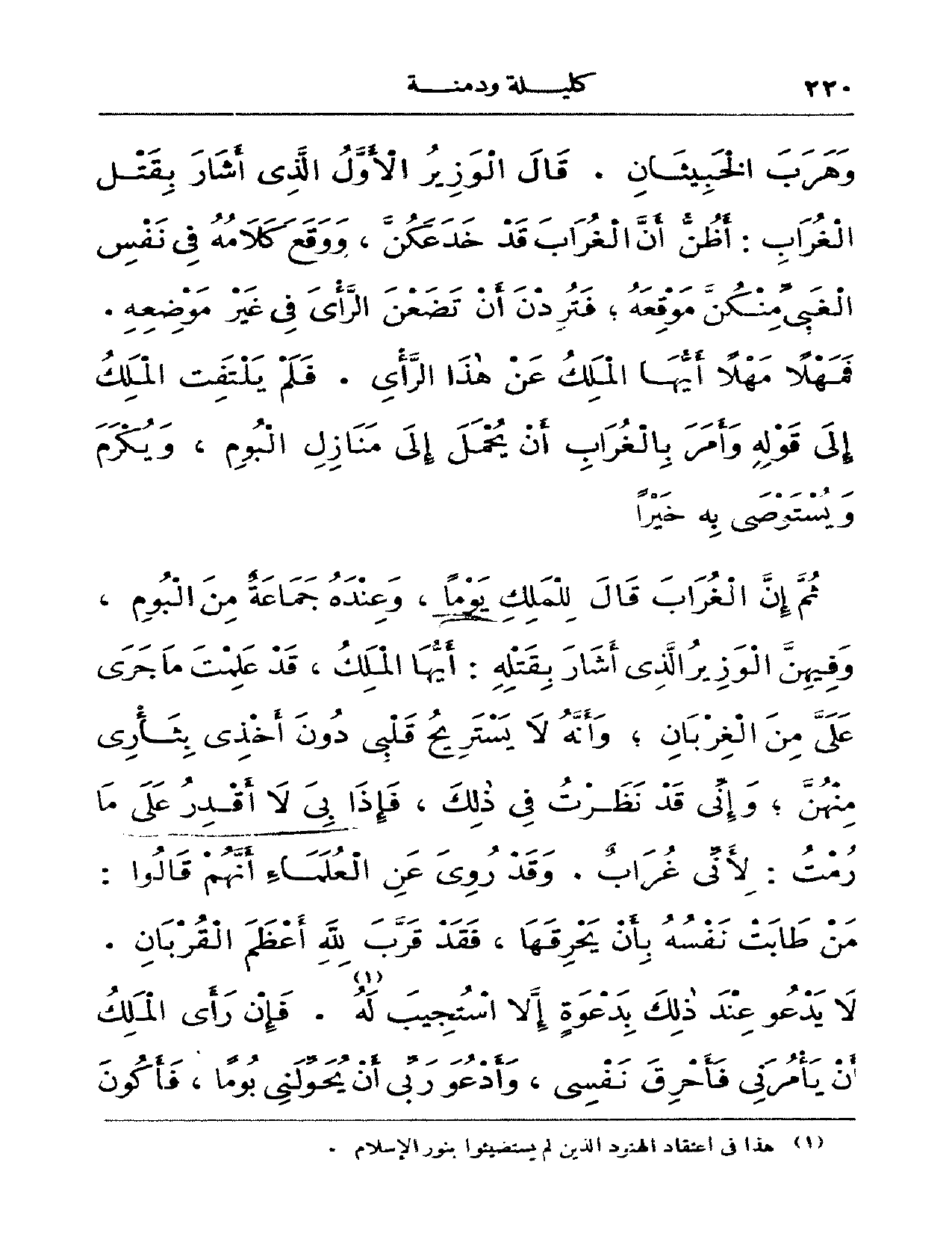 وهرب الخبيثان. قال الوزير الأول الذي أشار بقتل الغراب: أظن أن الغراب قد خدعكنَّ ووقع كلامه في نفس الغبي منكنّ موقعه، فتردن أن تضعنّ الرأي في غير موضعه فمهلاً مهلاً أيها الملك عن هذا الرأي. فلم يلتفت الملك إلى قوله وأمر الغراب أن يحمل إلى منازل البوم، ويكرم ويستوصى به خيراً.