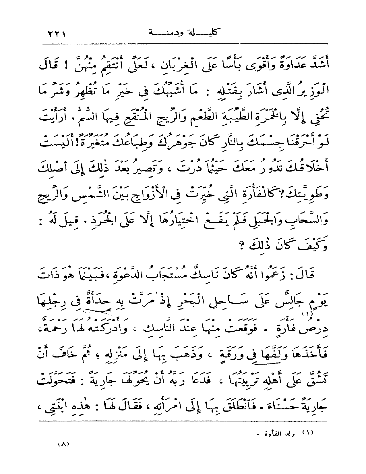 أشد عداوة وأقوى بأساً عل الغربان لعلي أنتقم منهن! قال الوزير الذي أشار بقتله: ما أشبهك في خير ما تظهر وشر ما تخفي إلا بالخمرة الطيبة الطعم والريح المنقع فيها السم أرأيت لو أحرقنا جسمك بالنار كان جوهرك وطباعك متغيرة! أليست أخلاقك تدور معك حيثما درت، وتصير بعد ذلك إلى أصلك وطويتك؟ كالفأرة التي خيرت في الأزواج بين الشمس والريح والسحاب والجبل فلم يقع اختيارها إلا على الجرذ وقيل له: وكيف كان ذلك؟