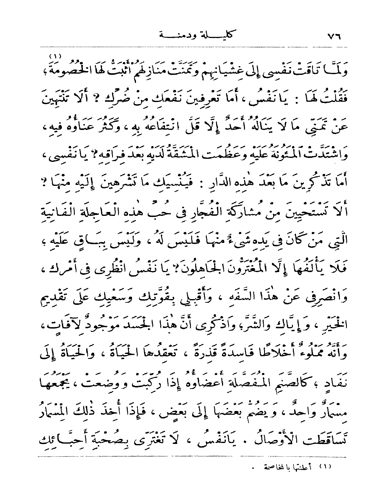 لما تاقت نفسي إلى غشيانهم وتمنت منازلهم أثبت لها الخصومة؛ فقلت لها: يا نفس، أما تعرفين نفعك من ضرك؟ ألا تنتهين عن تمني ما لا يناله أحد إلا قلّ انتفاعه به، وكثر عناؤه فيه، واشتدت المئونة عليه وعظمت المشقة لديه بعد فراقه؟ يا نفسي، أما تذكرين ما بعد هذه الدار: فينسيك ما تشرهين إليه منها؟ ألا تستحبين من مشاركة الفجار في حب هذه العاجلة الفانية التي من كان في يده شيءٌ منها فليس له، وليس بباقٍ عليه؛ فلا يألفها إلا المغترون الجاهلون؟ يا نفس انظري في أمرك، وانصرفي عن هذا السفه، وأقبلي بقوتك وسعيك على تقديم الخير، وإياك والشر، واذكري أن هذا الجسد موجودٌ لآفاتٍ، وأنه مملوءٌ أخلاطاً فاسدةً قذرةً، تعقدها الحياة، والحياة إلى نفادٍ؛ كالصنم المفصلة أعضاؤه إذا ركبت ووضعت، يجمعها مسمارٌ واحدٌ، ويضم يعضها إلى بعضٍ، فإذا أخذ ذلك المسمار تساقطت الأوصال. يا نفس، لا تغتري بصحبة أحبائك