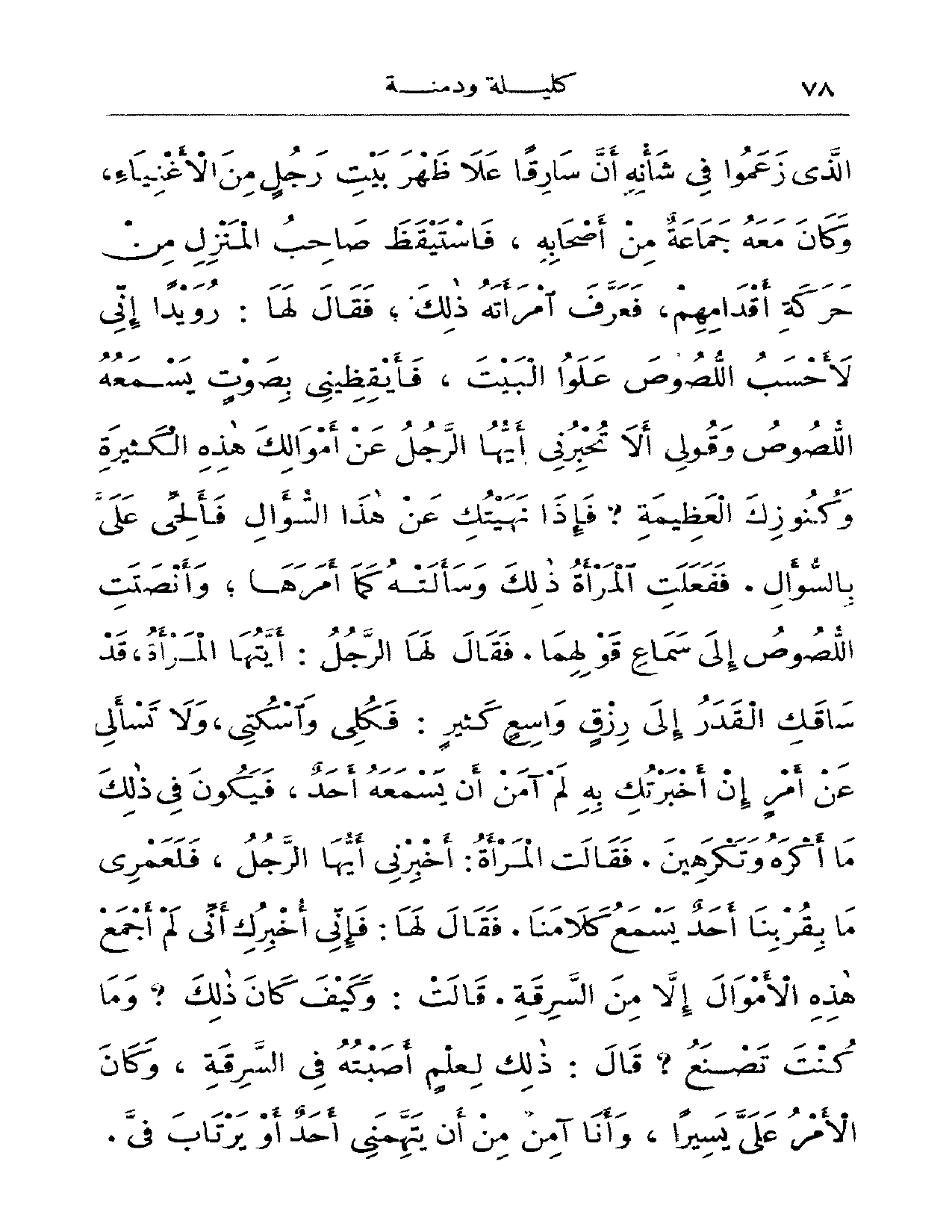وتكرهين. فقالت المرأة: أخبرني أيها الرجل، فلعمري ما بقربنا أحدٌ يسمع كلامنا. فقال لها: فإني أخبرك أني لم أجمع هذه الأموال إلا من السرقة. قال: وكيف كان ذلك؟ وما كنت تصنع؟ قال: ذلك لعلمٍ أصبته في السرقة، وكان الأمر علي يسيراً، وأنا آمن من أن يتهمني أحدٌ أو يرتاب في. ين. فقالت المرأة: أخبرني أيها الرجل، فلعمري ما بقربنا أحدٌ يسمع كلامنا. فقال لها: فإني أخبرك أني لم أجمع هذه الأموال إلا من السرقة. قال: وكيف كان ذلك؟ وما كنت تصنع؟ قال: ذلك لعلمٍ أصبته في السرقة، وكان الأمر علي يسيراً، وأنا آمن من أن يتهمني أحدٌ أو يرتاب في.