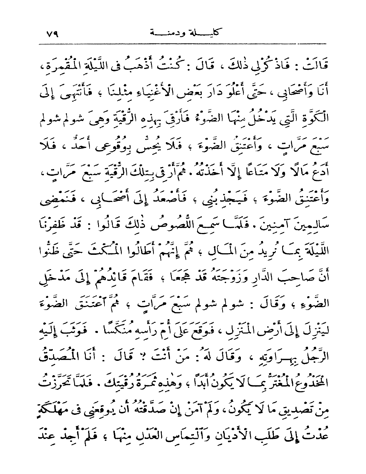 قالت: فاذكر لي ذلك، قال: كنت أذهب في الليلة المقمرة، أنا وأصحابي، حتى أعلو داء بعض الأغنياء مثلنا؛ فأنتهي إلى الكوة التي يدخل منها الضوء فأرقي بهذه الرقية وهي شولم شولم سبع مرات، وأعتنق الضوء؛ فلا يحس بوقوعي أحدٌ، فلا أدع مالاً ولا متاعاً إلا أخذته. ثم أرقي بتلك الرقية سبع مراتٍ. وأعتنق الضوء فيجذبني؛ فأصعد إلى أصحابي، فنمضي سالمين آمنين. فلما سمع اللصوص ذلك قالوا: قد ظفرنا الليلة بما نريد من المال؛ ثم إنهم أطالوا المكث حتى ظنوا أن صاحب الداء وزوجته قد هجعا؛ فقام قائدهم إلى مدخل الضوء؛ وقال: شولم شولم سبع مراتٍ؛ ثم اعتنق الضوء لينزل إلى أرض المنزل، فوقع على أم رأسه منكساً. فوثب إليه الرجل بهراوته، وقال له: من أنت؟ قال: أنا المصدق المخدوع المغتر يما لا يكون أبداً؛ وهذه ثمرة رقيتك. فلما تحرزت من تصديق ما لا يكون، ولم آمن إن صدقته أن يوقعني في مهلكةٍ عدت إلى طلب الأديان والتماس العدل منها؛ فلم أجد عند