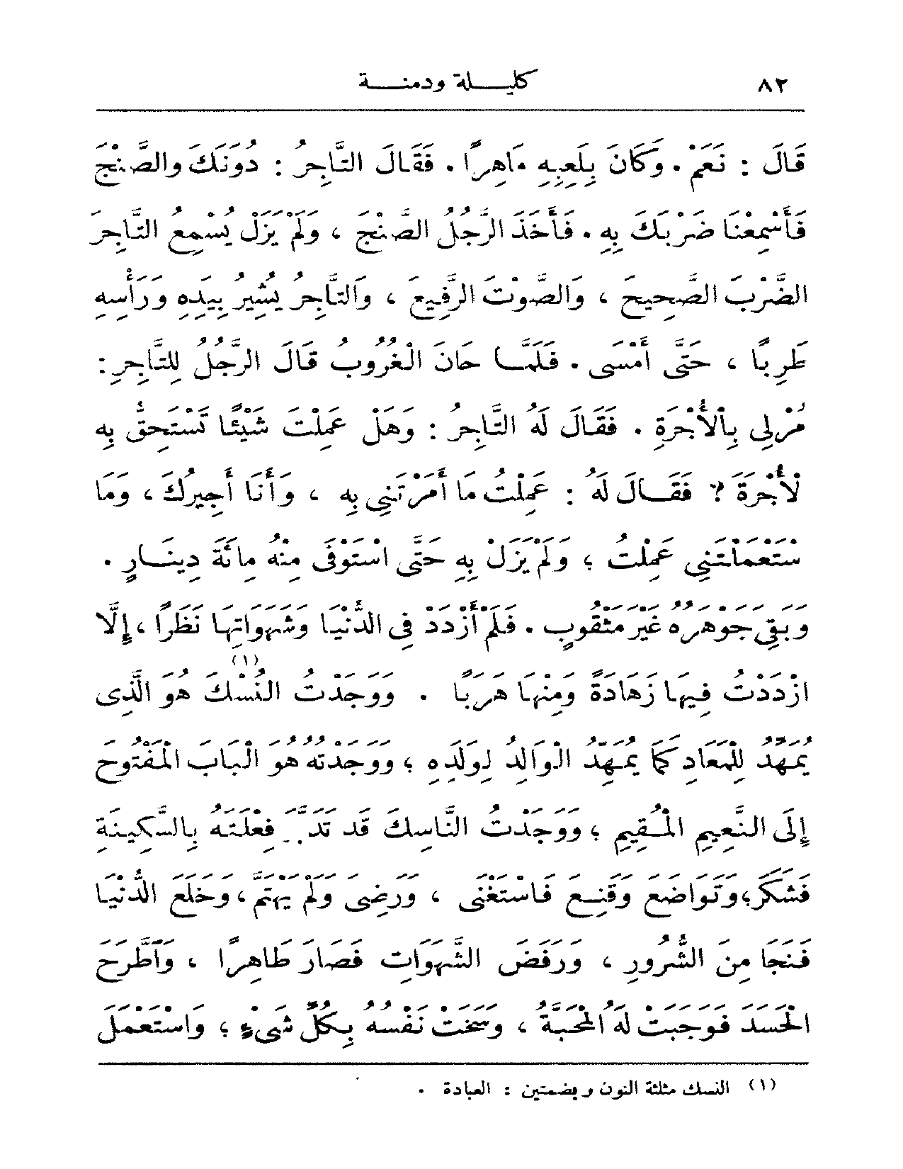 قال نعم. وكان بلعبه ماهراً. فقال التاجر: دونك الصنج فأسمعنا ضربك به. فأخذ الرجل الصنج، ولم يزل يسمع التاجر الضرب الصحيح، والصوت الرفيع، والتاجر يشير بيده ورأسه طرباً، حتى أمسى. فلما حان وقت الغروب قال الرجل للتاجر: مر لي بالأجرة. فقال له التاجر: وهل عملت شيئاً تستحق به الأجرة؟ فقال له: عملت ما أمرتني به، وأنا أجيرك، وما استعملتني عملت؛ ولم يزل به حتى استوفى منه مائة دينار. وبقي جوهره غير مثقوب. فم أزدد في الدنيا وشهواتها نظراً، إلا ازددت فيها زهادةً ومنها هرباً. ووجدت النسك هو الذي يمهد للمعاد كما يمهد الوالد لولده؛ ووجدته هو الباب المفتوح إلى النعيم المقيم؛ ووجدت الناسك قد تدبر فعلته بالسكينة فشكر؛ وتواضع وقنع فاستغنى، ورضي ولم يهتم، وخلع الدنيا فنجا من الشرور، ورفض الشهوات فصار طاهراً، واطرح الحسد فوجبت له المحبة، وسخت نفسه بك شيءٍ؛ واستعمل