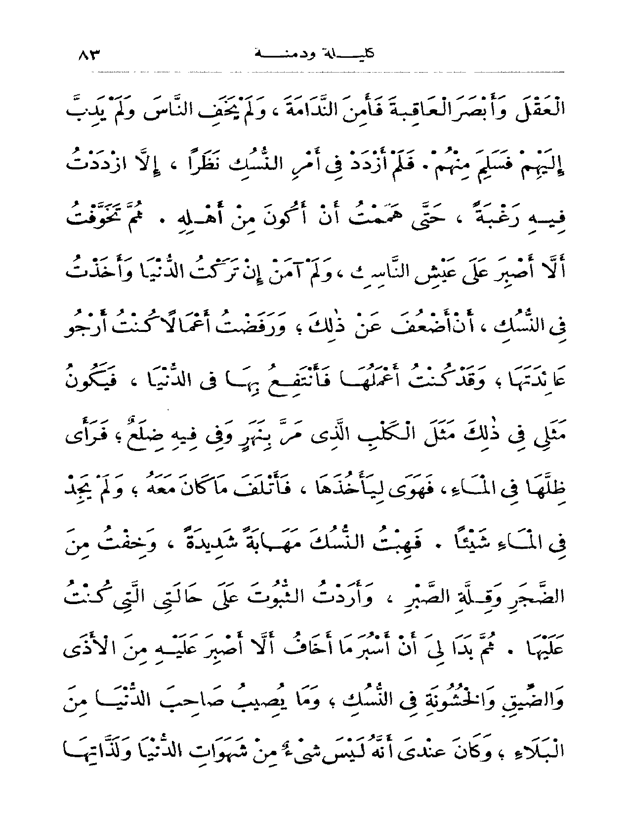 العقل وأبصر العاقبة فأمن الندامة، ولم يخف الناس ولم يدب إليهم فسلم منهم. فلم أزدد في أمر النسك نظراً، إلا ازددت فيه رغبةً، حتى هممت أن أكون من أهله. ثم تخوفت ألا أصبر على عيش الناسك، ولم آمن إن تركت الدنيا وأخذت في النسك، أن أضعف عن ذلك؛ ورفضت إعمالاً كنت أرجو عائدتها؛ وقد كنت أعملها فأنتفع بها في الدنيا، فيكون مثلي في ذلك مثل الكلب الذي مر بنهرٍ وفي فيه ضلعٌ، فرأى ظلها في الماء، فهوى ليأخذها، فأتلف ما كان معه؛ ولم يجد في الماء شيئاً. فهبت النسك مهابةً شديدةً، وخفت من الضجر وقلة الصبر، وأردت الثبوت على حالتي التي كنت عليها. ثم بدا لي