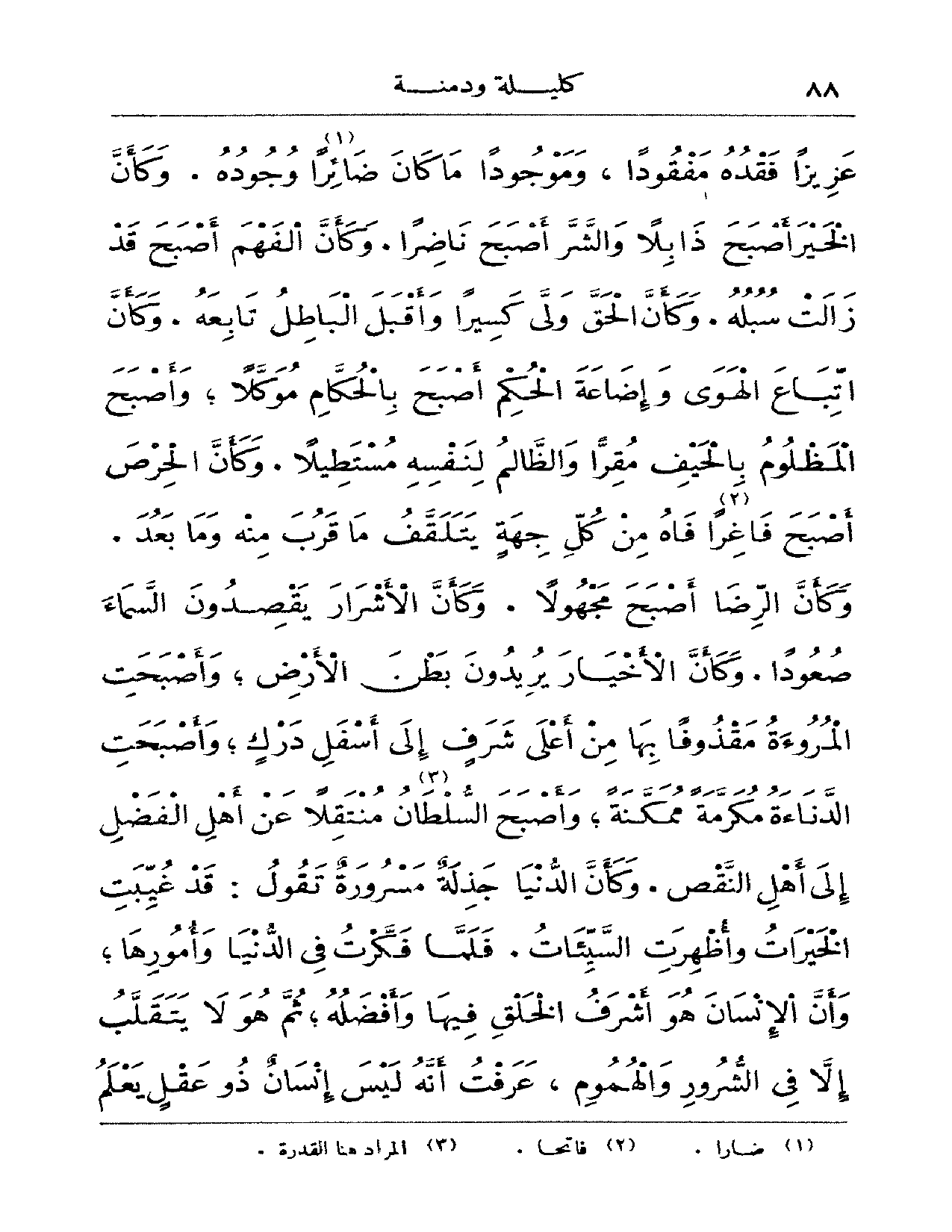 عزيزاً فقده مفقوداً، وموجوداً ما كان ضائراً وجوده. وكأن الخير أصبح ذابلاً والشر أصبح ناضراً. وكأن الفهم أصبح قد زالت سبله. وكأن الحق ولى كسيراً وأقبل الباطل تابعه. وكأن اتباع الهوى وإضاعة الحكم أصبح بالحكام موكلاً؛ وأصبح المظلوم بالحيف مقراً والظالم لنفسه مستطيلاً. وكأن الحرص أصبح فاغراً فاه من كل وجهةٍ يتلقف ما قرب منه وما بعد. وكأن الرضا أصبح مجهولاً. وكأن الأشرار يقصدون السماء صعوداً. وكأن الأخيار يريدون بطن الأرض؛ وأصبحت الدناءة مكرمةٌ ممكنةٌ؛ وأصبح السلطان منتقلاً عن أهل الفضل إلى أهل النقص. وكأن الدنيا جذلة مسرورةٌ تقول: قد غيبت الخيرات وأظهرت السيئات. فلما فكرت في الدنيا وأمورها؛ وأن الإنسان هو أشرف الخلق فيها وأفضله؛ ثم هو لا يتقلب إلا في الشرور والهموم، عرفت أنه ليس إنسانٌ ذو عقلٍ يعلم