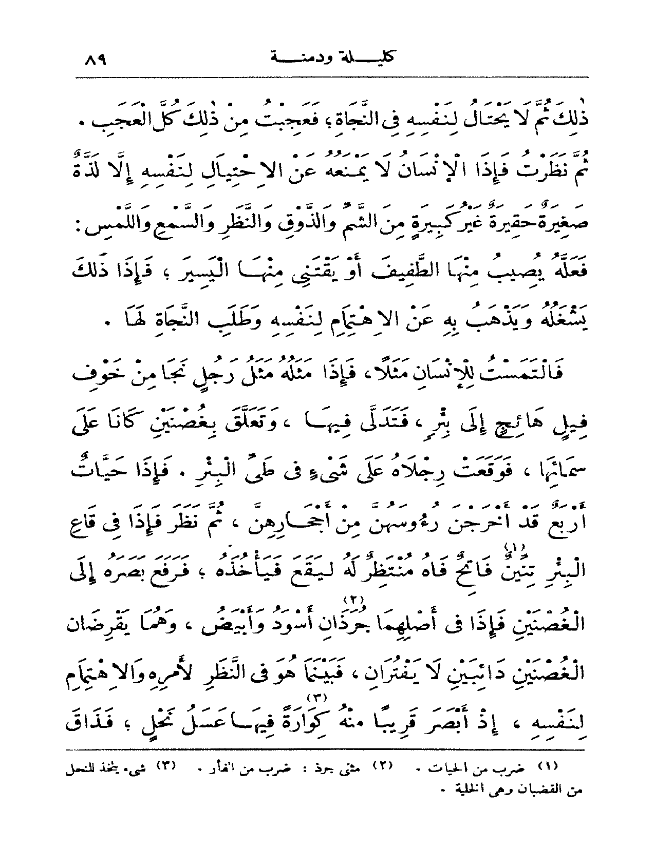 فالتمست للإنسان مثلاً، فإذا مثله مثل رجلٍ نجا من خوف فيلٍ هائجٍ إلى بئرٍ، فتدلى فيها، وتعلق بغصنين كانا على سمائها، فوقعت رجلاه على شيءٍ في طي البئر. فإذا حياتٌ أربع قد أخرجن رءوسهن من أحجارهن، ثم نظر فإذا في قاع البئر تنين فاتح فاه منتظر له ليقع فيأخذه؛ فرفع بصره إلى الغصنين فإذا في أصلهما جرذان أسود وأبيض، وهما يقرضان الغصنين دائبين لا يفتران، فبينما هو في النظر لأمره والاهتمام لنفسه، إذا أبصر قريباً منه كوارةً فيها عسل نحلٍ؛ فذاق