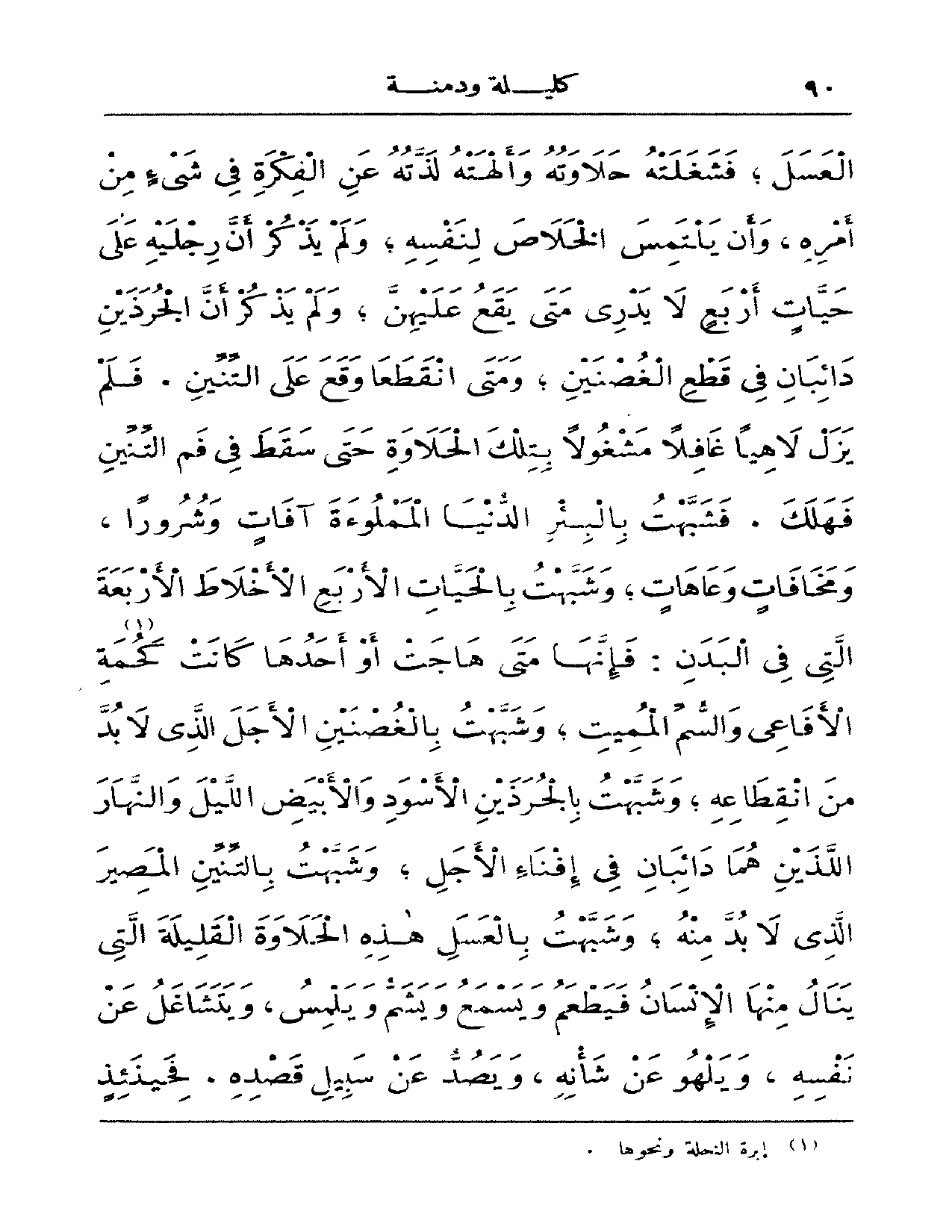 العسل، فشغلته حلاوته وألهته لذته عن الفكرة في شيءٍ من أمره، وأن يلتمس الخلاص لنفسه؛ ولم يذكر أن رجليه على حياتٍ أربعٍ لا يدري متى يقع عليهن؛ ولم يذكر أن الجرذين دائبان في قطع الغصنين؛ ومتى انقطعا وقع على التنين. فلم يزل لاهياً غافلاً مشغولاً بتلك الحلاوة حتى سقط في فم التنين فهلك. فشبهت بالبئر الدنيا المملوءة آفاتٍ وشروراً، ومخافاتٍ وعاهاتٍ؛ وشبهت بالحيات الأربع الأخلاط الأربعة التي في البدن: فإنها متى هاجت أو أحدها كانت كحمة الأفاعي والسم المميت؛ وشبهت بالجرذين الأسود والأبيض الليل والنهار اللذين هما دائبان في إفناء الأجل؛ وشبهت بالتنين المصير الذي لا بد منه؛ وشبهت بالعسل هذه الحلاوة القليلة التي ينال منها الإنسان فيطعم ويسمع ويشم ويلمس، ويتشاغل عن نفسه، ويلهو عن شأنه، ويصد عن سبيل قصده. فحينئذٍ