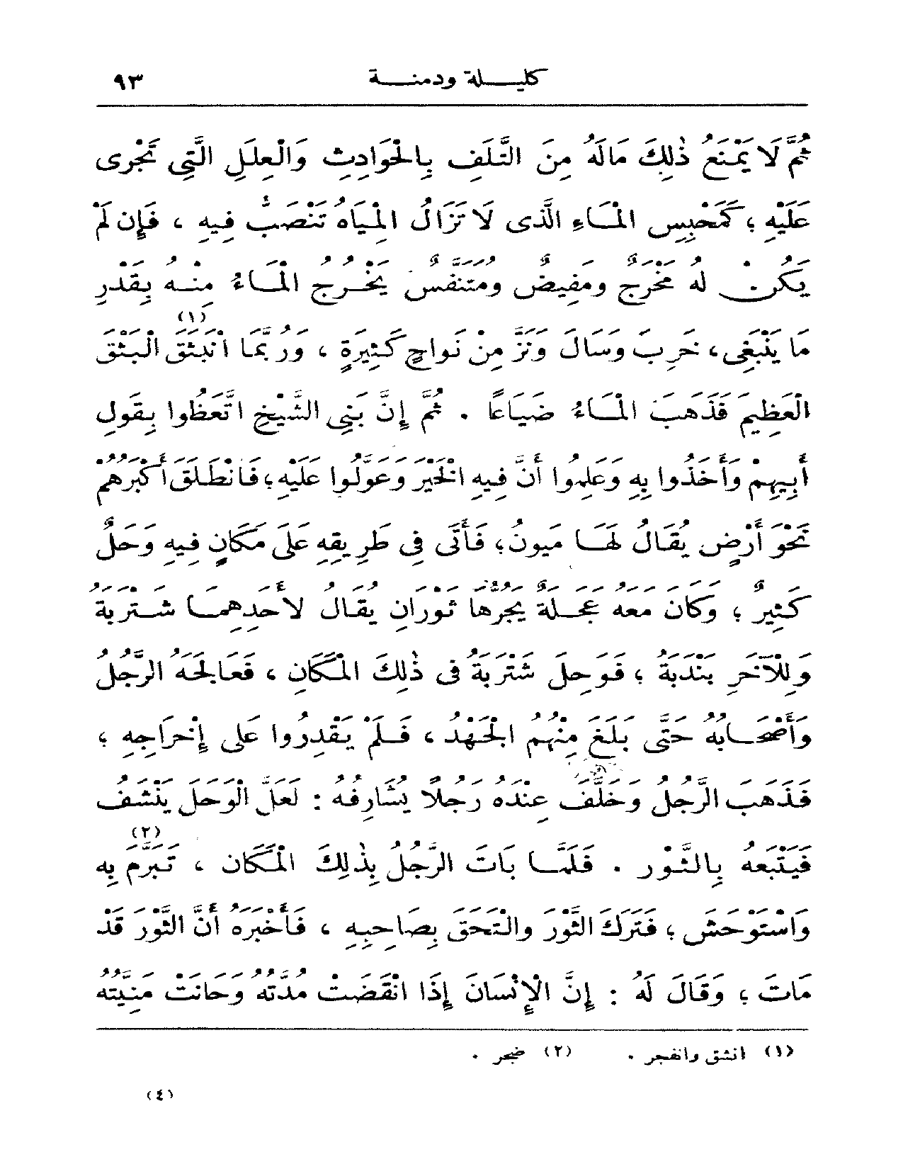 ثم لا يمنع ذلك ماله من التلف بالحوادث والعلل التي تجري عليه؛ كمحبس الماء الذي لا تزال المياه تنصب فيه، فإن لم يكن له مخرجٌ ومفيضٌ ومتنفسٌ يخرج الماء منه بقدر ما ينبغي، خرب وسال ونز من نواحٍ كثيرةٍ، وربما انبثق البثق العظيم فذهب الماء ضياعاً. ثم أنبني الشيخ اتعظوا بقول أبيهم وأخذوا به وعلموا أن فيه الخير وعولوا عليه؛ فانطلق أكبرهم نحو أرضٍ يقال لها ميون؛ فأتى في طريقه على مكانٍ فيه وحلٌ كثيرٌ؛ وكان معه عجلةٌ يجرها ثوران يقال لأحدهما شتربة وللآخر بندبة، فوحل شتربة في ذلك المكان، فعالجه الرجل وأصحابه حتى بلغ منهم الجهد، فلم يقدروا على إخراجه؛ فذهب الرجل وخلف عنده رجلاً يشارفه: لعل الوحل ينشف فيتبعه بالثور. فلما بات الرجل بذلك المكان، تبرم به واستوحش؛ فترك الثور والتحق بصاحبه، فأخبره أن الثور قد مات؛ وقال له: إن الإنسان إذا انقضت مدته وحانت منيته