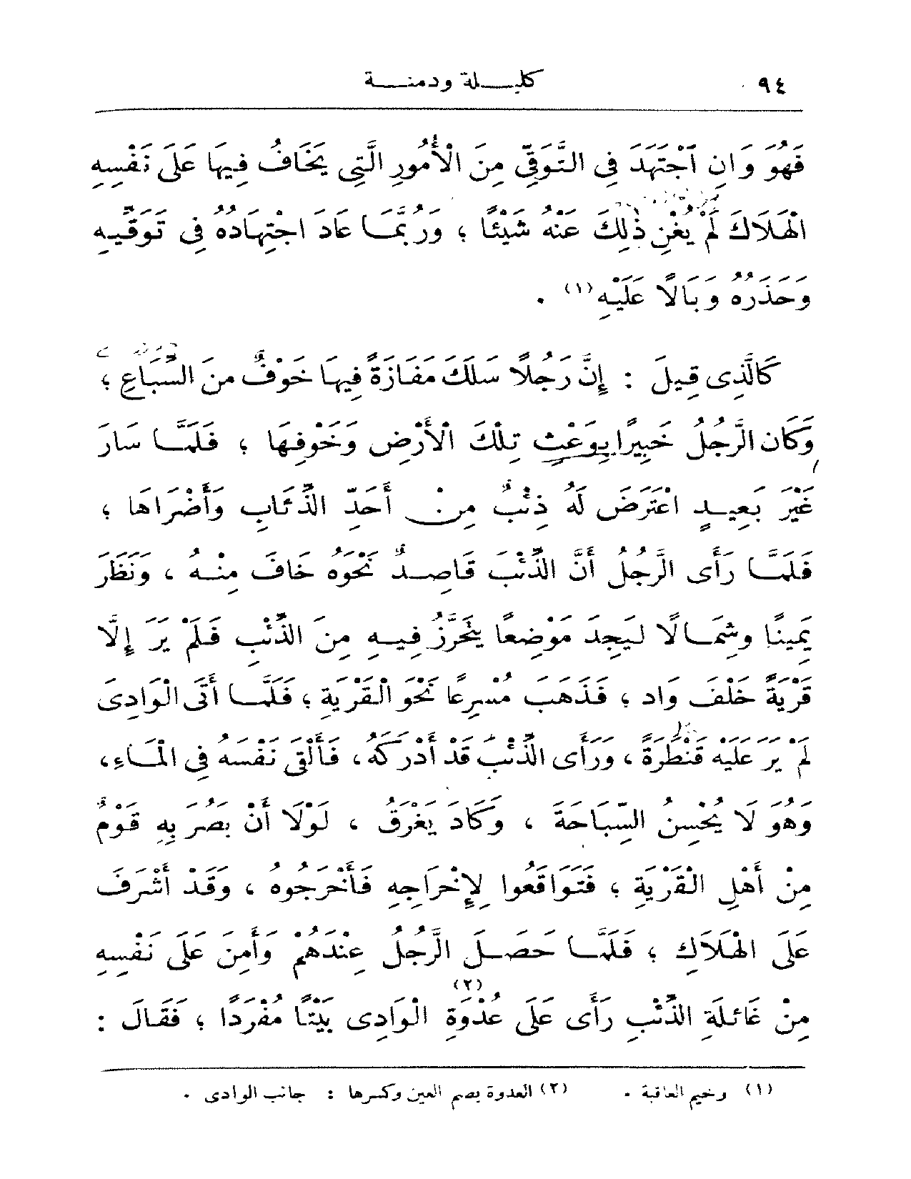 كالذي قيل: إن رجلاً سلك مفازةً فيها خوفٌ من السباع؛ وكان الرجل خبيراً بوعث تلك الأرض وخوفها؛ فلما سار غير بعيد اعترض له ذئبٌ من أحد الذئاب وأضراها؛ فلما رأى الرجل أن الذئب قاصد نحوه خاف منه، ونظر يميناً وشمالاً ليجد موضعاً يتحرز فيه من الذئب فلم ير إلا قريةً خلف واد؛ ورأى الذئب قد أدركه، فألقى نفسه في الماء، وهو لا يحسن السباحة، وكاد يغرق، لولا أن بصر به قومٌ من أهل القرية؛ فتواقعوا لإخراجه فأخرجوه، وقد أشرف على الهلاك؛ فلما حصل الرجل عندهم وأمن على نفسه من غائلة الذئب رأى على عدوة الوادي بيتاً مفرداً؛ فقال: