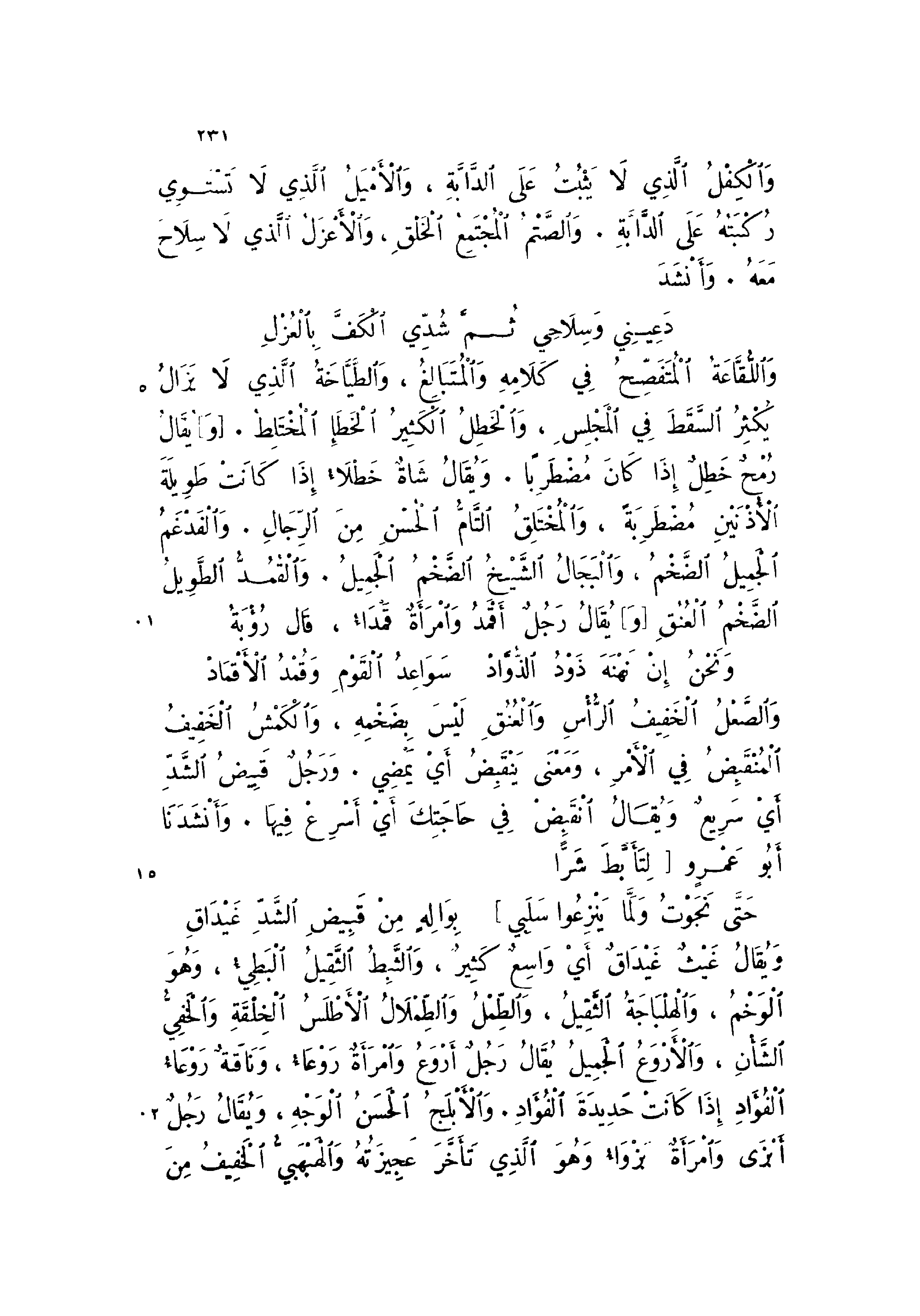 واللقاعة المتفصح في كلامه والمتبالغ، والطياخة الذي لا يزال يكثر السقط في المجلس، والخطل الكثير الخطإ المختلط. [و] يقال رمح خطل إذا كان مضطربا. ويقال شاة خطلاء إذا كانت طويلة الاذنين مضطربة، والمختلق التام الحسن من الرجال. والفدغم الجميل الضخم، والجبال الشيخ الضخم الجميل. والقمد الطويل الضخم العنق [و] يقال رجل أقمد وامرأة قمداء، قال رؤبة: