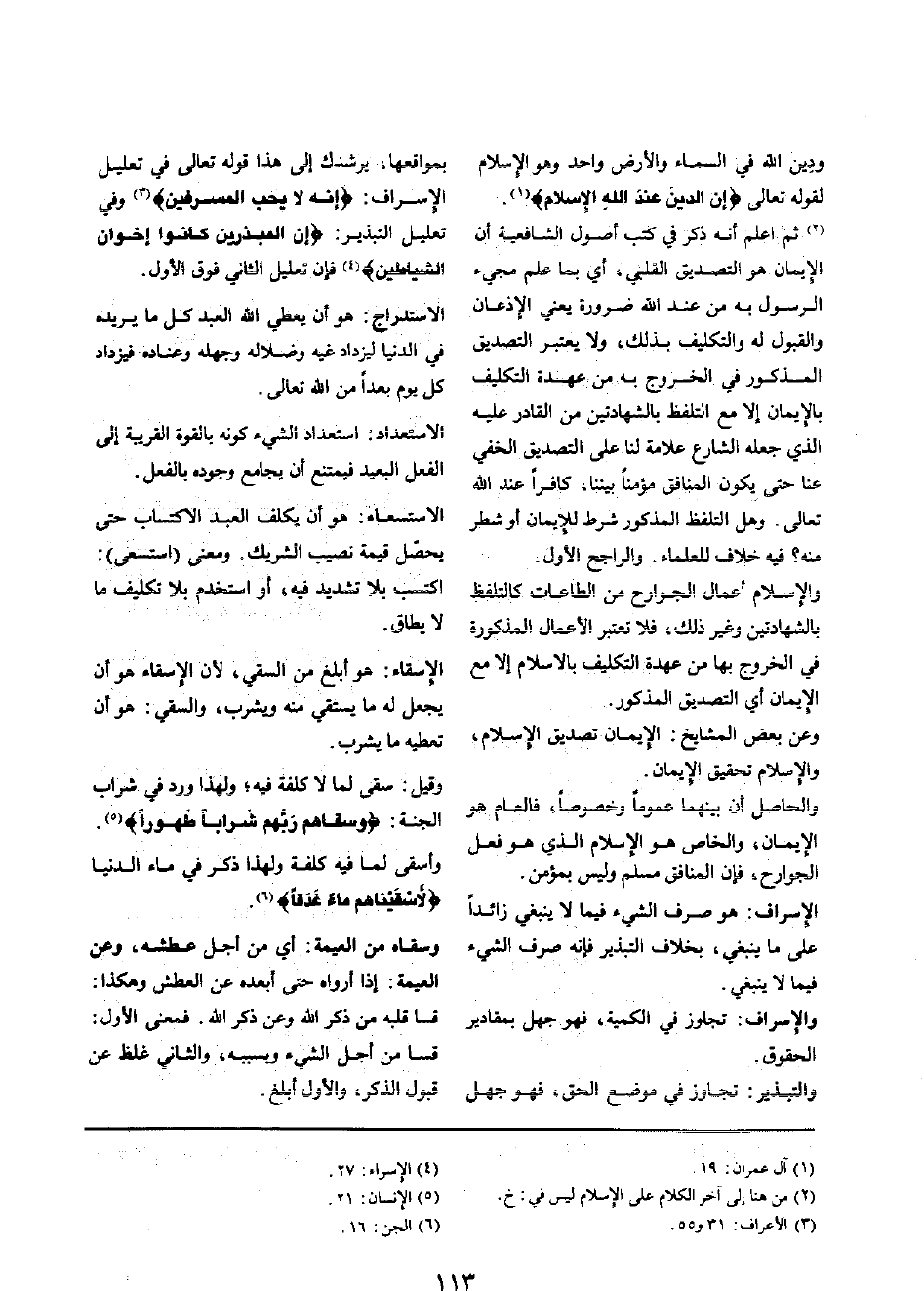 وَالْإِسْلَام أَعمال الْجَوَارِح من الطَّاعَات كالتلفظ بِالشَّهَادَتَيْنِ وَغير ذَلِك، فَلَا تعْتَبر الْأَعْمَال الْمَذْكُورَة فِي الْخُرُوج بهَا من عُهْدَة التَّكْلِيف بالاسلام إِلَّا مَعَ الْإِيمَان أَي التَّصْدِيق الْمَذْكُور