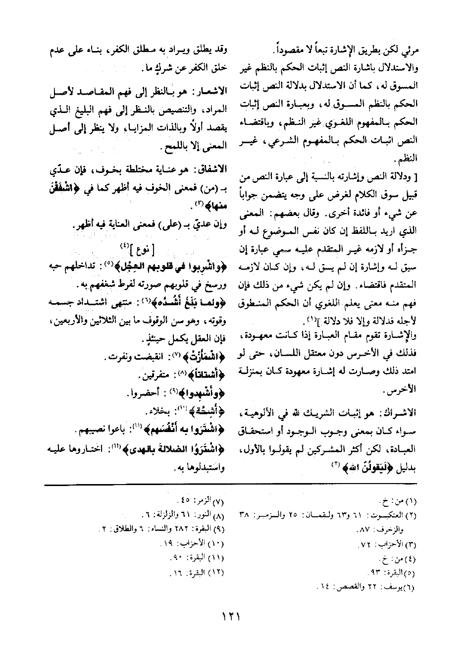 وَالِاسْتِدْلَال باشارة النَّص إِثْبَات الحكم بالنظم غير المسوق لَهُ، كَمَا أَن الِاسْتِدْلَال بِدلَالَة النَّص إِثْبَات الحكم بالنظم المسوق لَهُ، وَبِعِبَارَة النَّص إِثْبَات الحكم بِالْمَفْهُومِ اللّغَوِيّ غير النّظم، وباقتضاء النَّص اثبات الحكم بِالْمَفْهُومِ الشَّرْعِيّ، غير النّظم