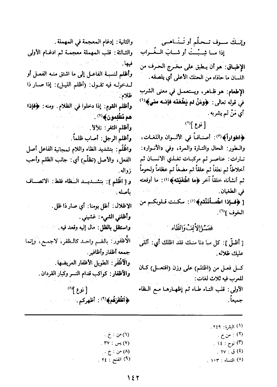 الْإِطْعَام: هُوَ ظَاهر، وَيسْتَعْمل فِي معنى الشّرْب فِي قَوْله تَعَالَى: {وَمن لم يطعمهُ فَإِنَّهُ مني} أَي من لم يشربه [نوع] {أطوارا} : أصنافا فِي الألوان واللغات، وَالطور: الْحَال والتارة والمرة، وَفِي " الْأَنْوَار ": تارات: عناصر ثمَّ مركبات تغذي الانسان ثمَّ أخلاطا ثمَّ نطفا ثمَّ علقا ثمَّ مضغا ثمَّ عضاما ولحوما ثمَّ أَنْشَأْنَاهُ خلقا آخر {مَا أطغيته} : مَا أوقعته فِي الطغيان