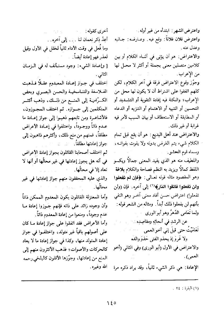 وَأما الْأَعْرَاض فقد اتَّفقُوا على جَوَاز إِعَادَة مَا كَانَ على أصولهم بَاقِيا غير متولد، وَاخْتلفُوا فِي جَوَاز إِعَادَة الْمُتَوَلد مِنْهَا، وَكَذَا فِي جَوَاز إِعَادَة مَا لَا يُعَاد كالحركات والأصوات؛ فَذهب الْأَكْثَرُونَ مِنْهُم إِلَى الْمَنْع من إِعَادَتهَا، وجوزها الأقلون كالبلخي رَحمَه الله وَغَيره