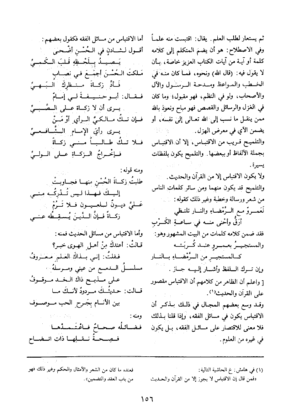 ثمَّ يستعار لطلب الْعلم يُقَال: اقتبست مِنْهُ علما وَفِي الِاصْطِلَاح: هُوَ أَن يضم الْمُتَكَلّم إِلَى كَلَامه كلمة أَو آيَة من آيَات الْكتاب الْعَزِيز خَاصَّة، بِأَن لَا يَقُول فِيهِ: (قَالَ الله) وَنَحْوه، فَمَا كَانَ مِنْهُ فِي الْخطب والمواعظ ومدحة الرَّسُول والآل وَالْأَصْحَاب، وَلَو فِي النّظم، فَهُوَ مَقْبُول؛ وَمَا كَانَ فِي الْغَزل والرسائل والقصص فَهُوَ مُبَاح ونعوذ بِاللَّه مِمَّن ينْقل مَا نسب إِلَى الله تَعَالَى إِلَى نَفسه، أَو يضمن الْآي فِي معرض الْهزْل