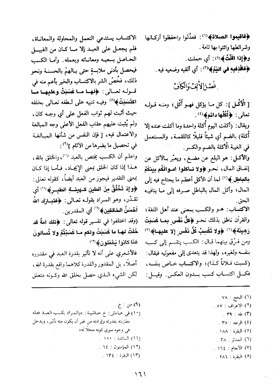 (وَقد اخْتلفُوا فِي تَفْسِير قَوْله تَعَالَى: {تِلْكَ أمة قد خلت لَهَا مَا كسبت وَلكم مَا كسبتم وَلَا تسْأَلُون عَمَّا كَانُوا يعْملُونَ} فالأشعري على أَنه لَا تَأْثِير بقدرة الْبعد فِي مقدوره أصلا، بل الْمَقْدُور وَالْقُدْرَة كِلَاهُمَا وَاقع بقدرة الله، لَكِن الشَّيْء الَّذِي حصل بِخلق الله وَكَونه مُتَعَلق