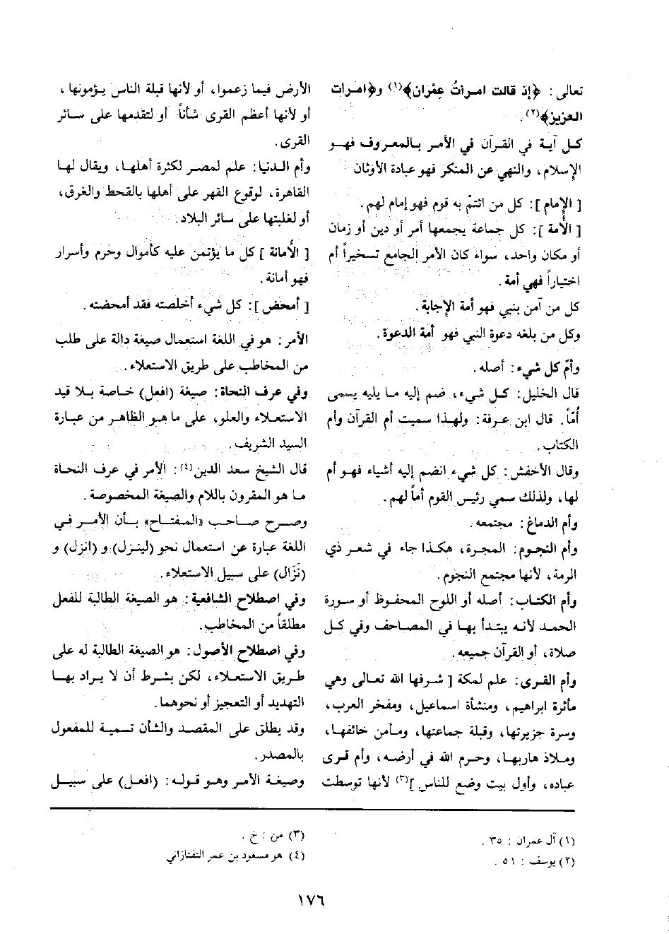 [الْأمة] : كل جمَاعَة يجمعها أَمر أَو دين أَو زمَان أَو مَكَان وَاحِد، سَوَاء كَانَ الْأَمر الْجَامِع تسخيرا أم اخْتِيَارا فَهِيَ أمة
