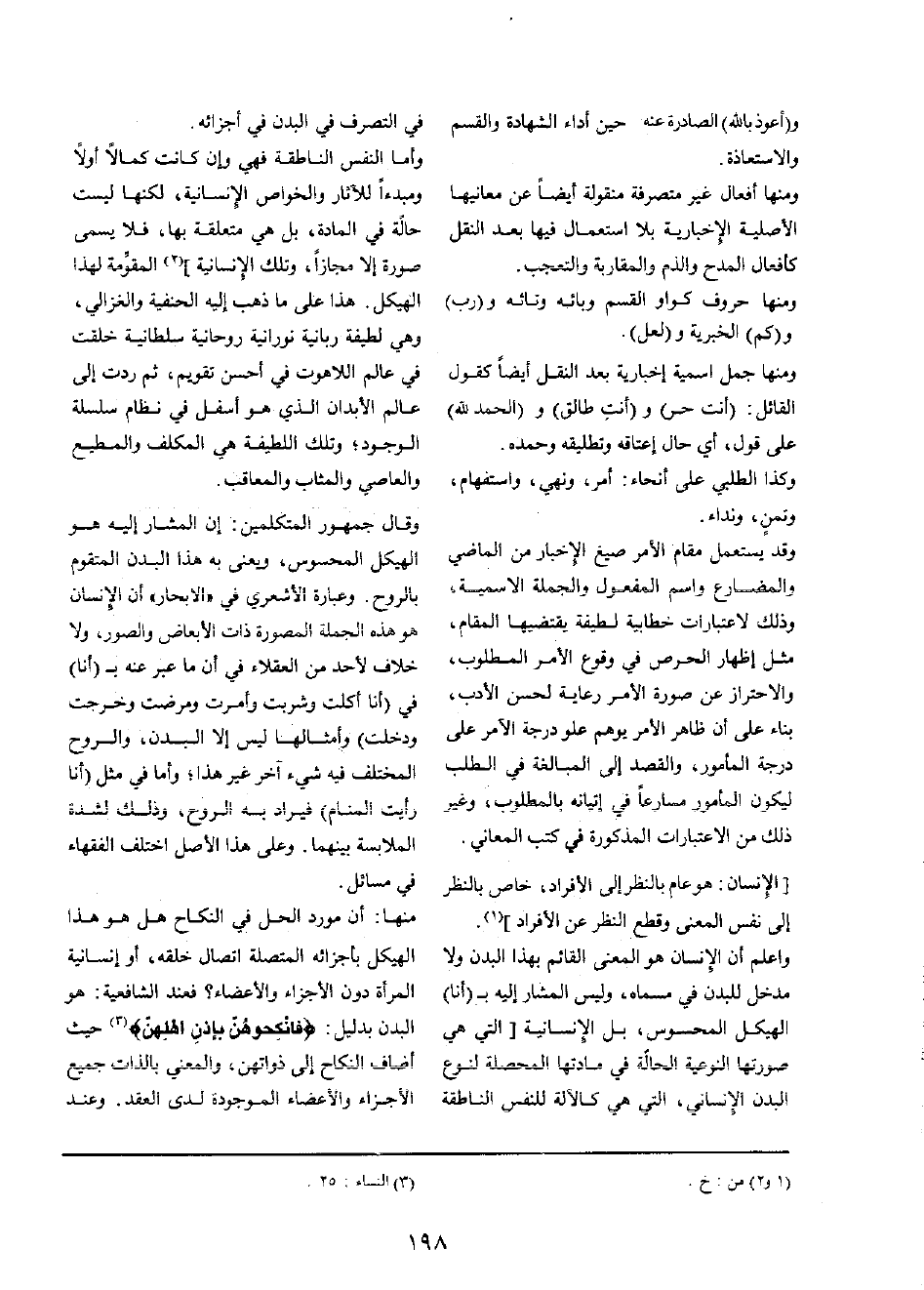 وَأما النَّفس الناطقة فَهِيَ وَإِن كَانَت كمالا أَولا ومبدءا للآثار والخواص الإنسانية، لَكِنَّهَا لَيست حَالَة فِي الْمَادَّة، بل هِيَ مُتَعَلقَة بهَا، فَلَا يُسمى صُورَة إِلَّا مجَازًا، وَتلك الإنسانية] المقومة لهَذَا الهيكل هَذَا على مَا ذهب إِلَيْهِ الْحَنَفِيَّة وَالْغَزالِيّ، وَهِي لَطِيفَة ربانية نورانية روحانية سلطانية خلقت فِي عَالم اللاهوت فِي أحسن تَقْوِيم، ثمَّ ردَّتْ إِلَى عَالم الْأَبدَان الَّذِي هُوَ أَسْفَل فِي نظام سلسلة الْوُجُود؛ وَتلك اللطيفة هِيَ الْمُكَلف والمطيع والعاصي والمثاب والمعاقب