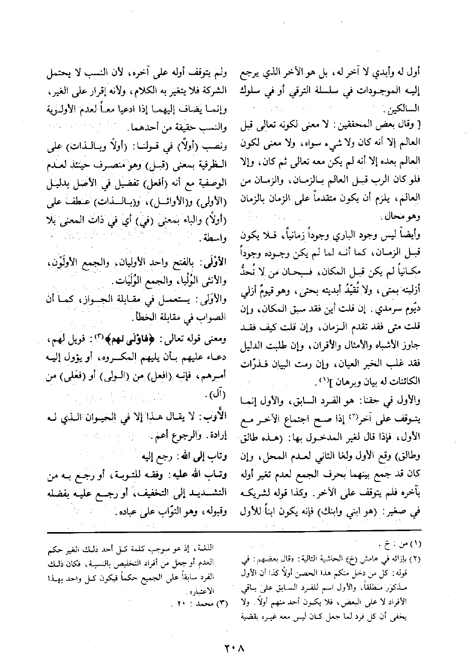 أول لَهُ وأبدي لَا آخر لَهُ، بل هُوَ الآخر الَّذِي يرجع إِلَيْهِ الموجودات فِي سلسلة الترقي أَو فِي سلوك السالكين