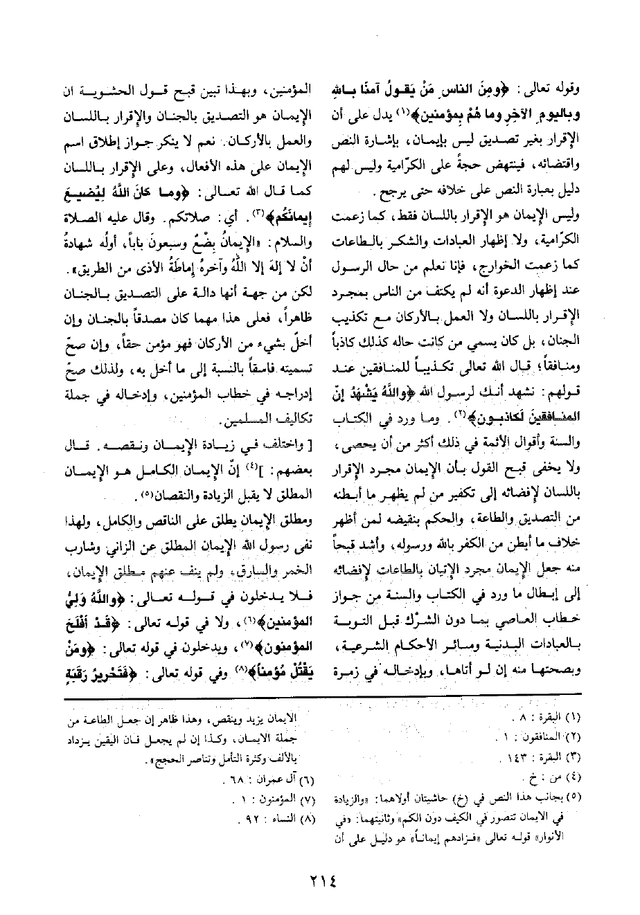 وَلَيْسَ الْإِيمَان هُوَ الْإِقْرَار بِاللِّسَانِ فَقَط، كَمَا زعمت الكرامية، وَلَا إِظْهَار الْعِبَادَات وَالشُّكْر بالطاعات كَمَا زعمت الْخَوَارِج، فَإنَّا نعلم من حَال الرَّسُول عِنْد إِظْهَار الدعْوَة أَنه لم يكتف من النَّاس بِمُجَرَّد الْإِقْرَار بِاللِّسَانِ وَلَا الْعَمَل بالأركان مَعَ تَكْذِيب الْجنان، بل كَانَ يُسَمِّي من كَانَت حَاله كَذَلِك كَاذِبًا ومنافقا؛ قَالَ الله تَعَالَى تَكْذِيبًا لِلْمُنَافِقين عِنْد قَوْلهم: نشْهد أَنَّك لرَسُول الله {وَالله يشْهد إِن الْمُنَافِقين لَكَاذِبُونَ} وَمَا ورد فِي الْكتاب وَالسّنة وأقوال الْأَئِمَّة فِي ذَلِك أَكثر من أَن يُحْصى، وَلَا يخفى قبح القَوْل بِأَن الْإِيمَان مُجَرّد الْإِقْرَار بِاللِّسَانِ لإفضائه إِلَى تَكْفِير من لم يظْهر مَا أبطنه من التَّصْدِيق وَالطَّاعَة، وَالْحكم بنقيضه لمن أظهر خلاف مَا أبطن من الْكفْر بِاللَّه وَرَسُوله، وَأَشد قبحا مِنْهُ جعل الْإِيمَان مُجَرّد الْإِتْيَان بالطاعات لإفضائه إِلَى إبِْطَال مَا ورد فِي الْكتاب وَالسّنة من جَوَاز خطاب العَاصِي بِمَا دون الشّرك قبل التَّوْبَة بالعبادات الْبَدَنِيَّة وَسَائِر الْأَحْكَام الشَّرْعِيَّة، وبصحتها مِنْهُ إِن لَو أَتَاهَا، وبإدخاله فِي زمرة الْمُؤمنِينَ، وَبِهَذَا تبين قبح قَول الحشوية أَن الْأَيْمَان هُوَ التَّصْدِيق بالجنان وَالْإِقْرَار بِاللِّسَانِ وَالْعَمَل بالأركان نعم لَا يُنكر جَوَاز إِطْلَاق اسْم الْإِيمَان على هَذِه الْأَفْعَال، وعَلى الْإِقْرَار بِاللِّسَانِ كَمَا قَالَ الله تَعَالَى: {وَمَا كَانَ الله لِيُضيع إيمَانكُمْ} أَي: صَلَاتكُمْ وَقَالَ عَلَيْهِ الصَّلَاة وَالسَّلَام: " الْإِيمَان بضع وَسَبْعُونَ بَابا، أَوله شَهَادَة أَن لَا إِلَه إِلَّا الله وَآخره إمَاطَة الْأَذَى عَن الطَّرِيق " لَكِن من جِهَة أَنَّهَا دَالَّة على التَّصْدِيق بالجنان ظَاهرا، فعلى هَذَا مهما كَانَ مُصدقا بالجنان وَإِن أخل بِشَيْء من الْأَركان فَهُوَ مُؤمن حَقًا، وَإِن صَحَّ تَسْمِيَته فَاسِقًا بِالنِّسْبَةِ إِلَى مَا أخل بِهِ، وَلذَلِك صَحَّ إدراجه فِي خطاب الْمُؤمنِينَ، وإدخاله فِي جملَة تكاليف الْمُسلمين