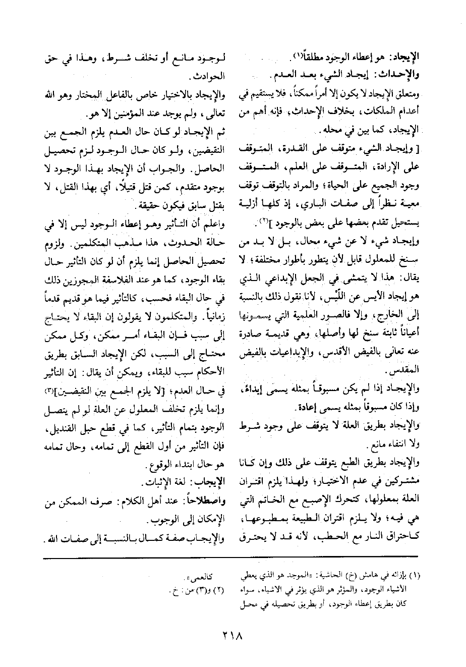 وَاعْلَم أَن التَّأْثِير وَهُوَ إِعْطَاء الْوُجُود لَيْسَ إِلَّا فِي حَالَة الْحُدُوث، هَذَا مَذْهَب الْمُتَكَلِّمين وَلُزُوم تَحْصِيل الْحَاصِل إِنَّمَا يلْزم أَن لَو كَانَ التَّأْثِير حَال بَقَاء الْوُجُود، كَمَا هُوَ عِنْد الفلاسفة المجوزين ذَلِك فِي حَال الْبَقَاء فَحسب، كالتأثير فِيمَا هُوَ قديم قدما زمانيا والمتكلمون لَا يَقُولُونَ إِن الْبَقَاء لَا يحْتَاج إِلَى سَبَب فَإِن الْبَقَاء أَمر مُمكن، وكل مُمكن مُحْتَاج إِلَى السَّبَب، لَكِن الإيجاد السَّابِق بطرِيق الْأَحْكَام سَبَب للبقاء، وَيُمكن أَن يُقَال: إِن التَّأْثِير فِي حَال الْعَدَم؛ [لَا يلْزم الْجمع بَين النقيضين] وَإِنَّمَا يلْزم تخلف الْمَعْلُول عَن الْعلَّة لَو لم يتَّصل الْوُجُود بِتمَام التَّأْثِير، كَمَا فِي قطع حَبل الْقنْدِيل، فَإِن التَّأْثِير من أول الْقطع إِلَى تَمَامه، وَحَال تَمَامه هُوَ حَال ابْتِدَاء الْوُقُوع