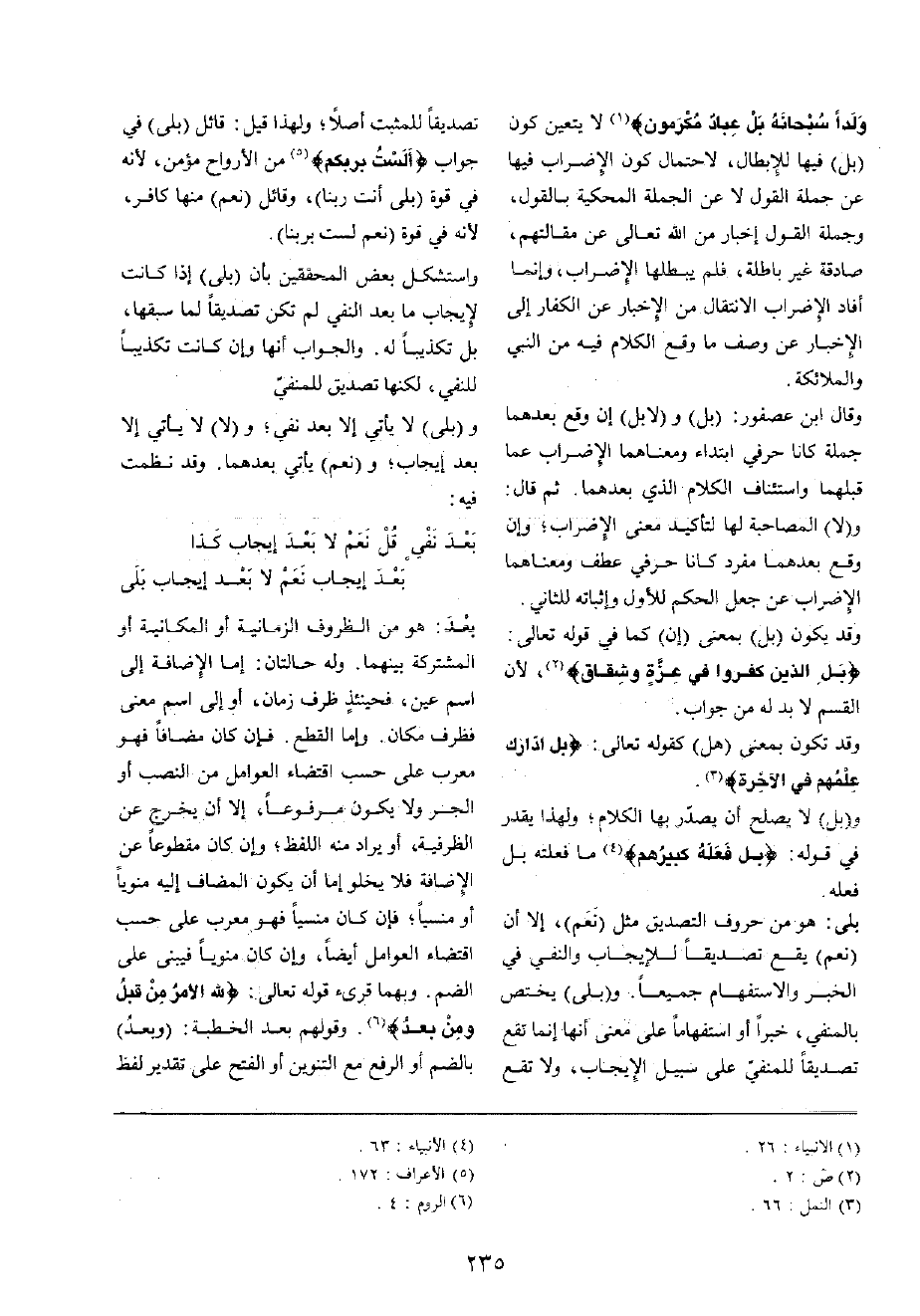 بلَى: هُوَ من حُرُوف التَّصْدِيق مثل (نعم) ، إِلَّا أَن (نعم) يَقع تَصْدِيقًا للْإِيجَاب وَالنَّفْي فِي الْخَبَر والاستفهام جَمِيعًا و (بلَى) يخْتَص بالمنفي، خَبرا أَو استفهاما على معنى أَنَّهَا إِنَّمَا تقع تَصْدِيقًا للمنفي على سَبِيل الْإِيجَاب، وَلَا تقع تَصْدِيقًا للمثبت أصلا؛ وَلِهَذَا قيل: قَائِل (بلَى) فِي جَوَاب {آلست بربكم} من الْأَرْوَاح مُؤمن، لِأَنَّهُ فِي قُوَّة (بلَى أَنْت رَبنَا) ، وَقَائِل (نعم) مِنْهَا كَافِر، لِأَنَّهُ فِي قُوَّة (نعم لست بربنا)