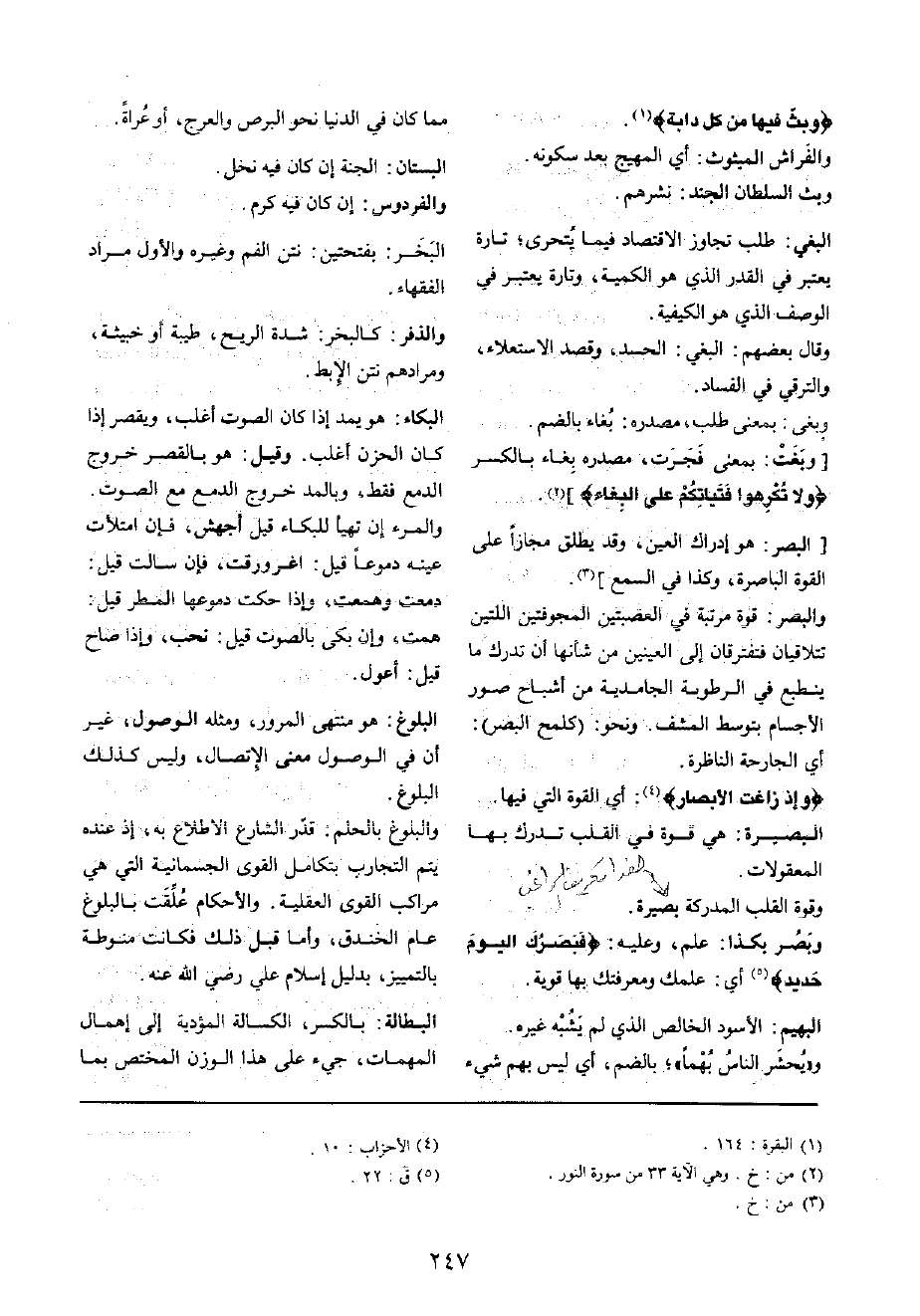 وَالْبَصَر: قُوَّة مرتبَة فِي العصبتين المجوفتين اللَّتَيْنِ تتلاقيان فتفترقان إِلَى الْعَينَيْنِ من شَأْنهَا أَن تدْرك مَا ينطبع فِي الرُّطُوبَة الجامدية من أشباح صور الْأَجْسَام بتوسط المشف وَنَحْو: (كلمح الْبَصَر) : أَي الْجَارِحَة الناظرة