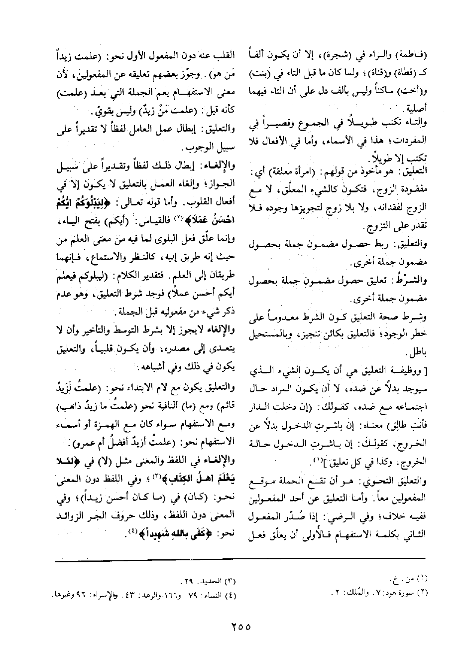 والإلغاء: إبِْطَال ذَلِك لفظا وتقديرا على سَبِيل الْجَوَاز؛ وإلغاء الْعَمَل بِالتَّعْلِيقِ لَا يكون إِلَّا فِي أَفعَال الْقُلُوب وَأما قَوْله تَعَالَى: {ليَبْلُوكُمْ أَيّكُم أحسن عملا} فَالْقِيَاس: (أَيّكُم) بِفَتْح الْيَاء، وَإِنَّمَا علق فعل الْبلوى لما فِيهِ من معنى الْعلم من حَيْثُ إِنَّه طَرِيق إِلَيْهِ، كالنظر وَالِاسْتِمَاع، فَإِنَّهُمَا طَرِيقَانِ إِلَى الْعلم فتقدير الْكَلَام: (ليَبْلُوكُمْ فَيعلم أَيّكُم أحسن عملا) فَوجدَ شَرط التَّعْلِيق، وَهُوَ عدم ذكر شَيْء من مفعوليه قبل الْجُمْلَة