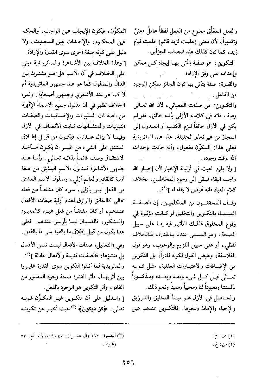 وَقَالَ الْمُحَقِّقُونَ من الْمُتَكَلِّمين: إِن الصّفة الْمُسَمَّاة بالتكوين والتخليق لَو كَانَت مُؤثرَة فِي وُقُوع الْمَخْلُوق فَذَلِك التَّأْثِير فِيهِ إِمَّا على سَبِيل الصِّحَّة، وَهُوَ الْمُسَمّى عندنَا بِالْقُدْرَةِ، فَالْخِلَاف لَفْظِي، أَو على سَبِيل اللُّزُوم وَالْوُجُوب، وَهُوَ قَول الفلاسفة، ونقيض القَوْل لكَونه قَادِرًا، بل التكوين من الإضافات والاعتبارات الْعَقْلِيَّة، مثل كَونه تَعَالَى قبل كل شَيْء وَمَعَهُ وَبعده ومذكورا بألسنتنا ومعبودا لنا ومحييا ومميتا وَنَحْو ذَلِك