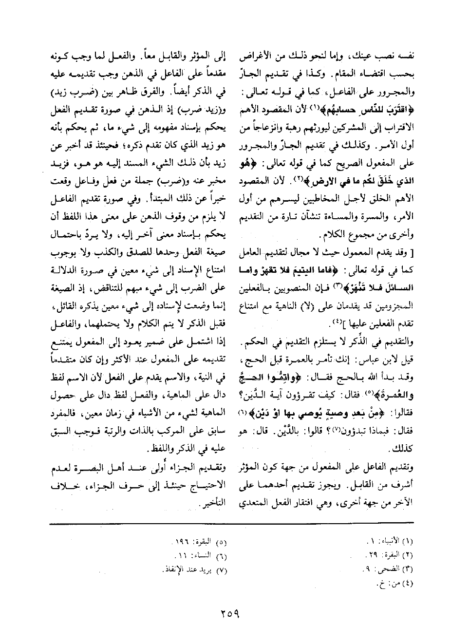 وَتَقْدِيم الْفَاعِل على الْمَفْعُول من جِهَة كَون الْمُؤثر أشرف من الْقَابِل وَيجوز تَقْدِيم أَحدهمَا على الآخر من جِهَة أُخْرَى، وَهِي افتقار الْفِعْل المعتدي إِلَى الْمُؤثر والقابل مَعًا وَالْفِعْل لما وَجب كَونه مقدما على الْفَاعِل فِي الذِّهْن وَوَجَب تَقْدِيمه عَلَيْهِ فِي الذّكر أَيْضا وَالْفرق ظَاهر بَين (ضرب زيد) و (زيد ضرب) إِذْ الذِّهْن فِي صُورَة تَقْدِيم الْفِعْل يحكم بِإِسْنَاد مَفْهُومه إِلَى شَيْء مَا، ثمَّ يحكم بِأَنَّهُ هُوَ زيد الَّذِي كَانَ تقدم ذكره؛ فَحِينَئِذٍ قد أخبر عَن زيد بِأَن ذَلِك الشَّيْء الْمسند إِلَيْهِ هُوَ هُوَ، فزيد مخبر عَنهُ و (ضرب) جملَة من فعل وفاعل وَقعت خَبرا عَن ذَلِك الْمُبْتَدَأ وَفِي صُورَة تَقْدِيم الْفَاعِل لَا يلْزم من وقُوف الذِّهْن على معنى هَذَا اللَّفْظ أَن يحكم بِإِسْنَاد معنى آخر إِلَيْهِ، وَلَا يرد بِاحْتِمَال صِيغَة الْفِعْل وَحدهَا للصدق وَالْكذب وَلَا بِوُجُوب امْتنَاع الْإِسْنَاد إِلَى شَيْء معِين فِي صُورَة الدّلَالَة على الضَّرْب إِلَى شَيْء مُبْهَم للتناقض، إِذا الصِّيغَة إِنَّمَا وضعت لإسناده إِلَى شَيْء معِين يذكرهُ الْقَائِل، فَقبل الذّكر لَا يتم الْكَلَام وَلَا يحتملهما، وَالْفَاعِل إِذا اشْتَمَل على ضمير يعود إِلَى الْمَفْعُول يمْتَنع تَقْدِيمه على الْمَفْعُول عِنْد الْأَكْثَر وَإِن كَانَ مُتَقَدما فِي النِّيَّة، وَالِاسْم يقدم على الْفِعْل لِأَن الِاسْم لفظ دَال على الْمَاهِيّة، وَالْفِعْل لفظ دَال على حُصُول الْمَاهِيّة لشَيْء من الْأَشْيَاء فِي زمَان معِين، فالمفرد سَابق على الْمركب بِالذَّاتِ والرتبة فَوَجَبَ السَّبق عَلَيْهِ فِي الذّكر وَاللَّفْظ