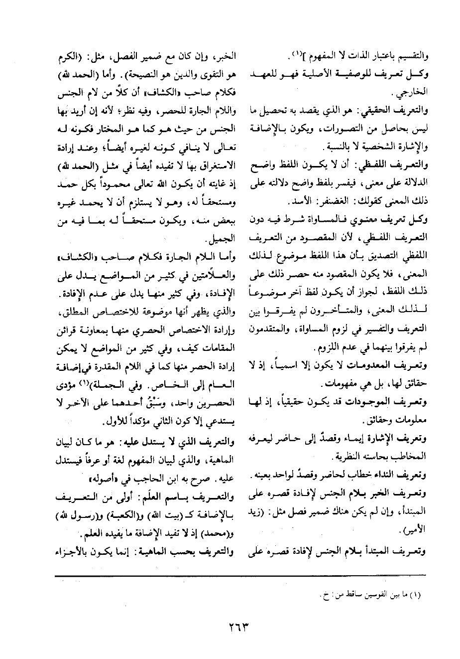 والتعريف الْحَقِيقِيّ: هُوَ الَّذِي يقْصد بِهِ تَحْصِيل مَا لَيْسَ بحاصل من التصورات، وَيكون بِالْإِضَافَة وَالْإِشَارَة الشخصية لَا بِالنِّسْبَةِ