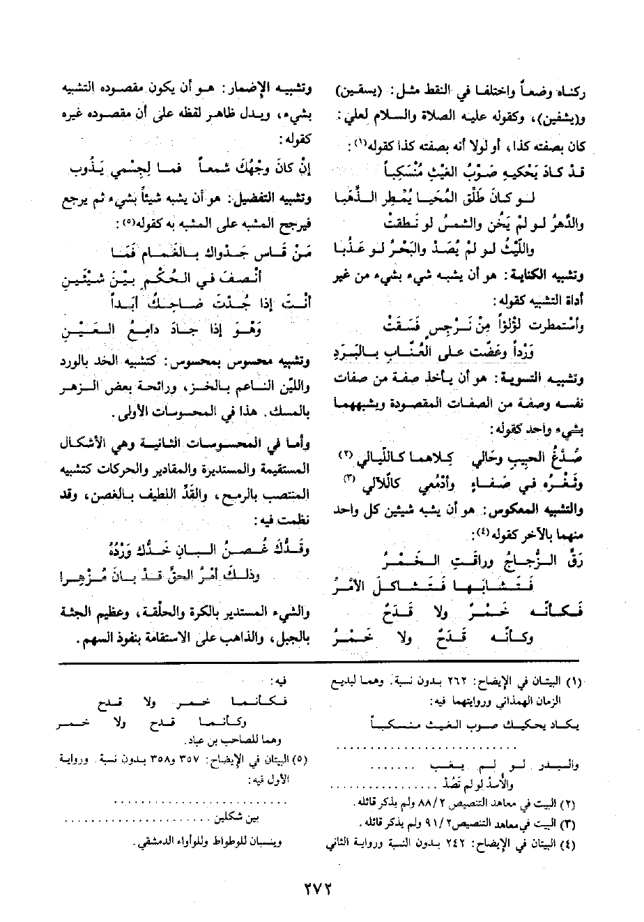 وَأما فِي المحسوسات الثَّانِيَة وَهِي الأشكال المستقيمة والمستديرة والمقادير والحركات كتشبيه المنتصب بِالرُّمْحِ، وَالْقد اللَّطِيف بالغصن، وَقد نظمت فِيهِ: