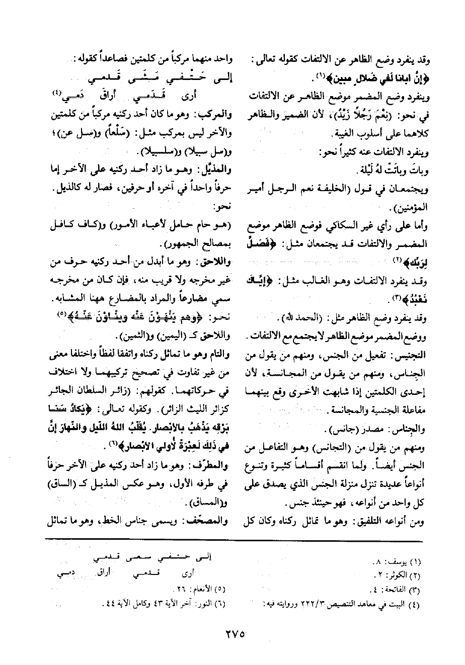 والتام وَهُوَ مَا تماثل ركناه واتفقا لفظا وَاخْتلفَا معنى من غير تفَاوت فِي تَصْحِيح تركيبهما وَلَا اخْتِلَاف فِي حركاتهما كَقَوْلِهِم: (زائر السُّلْطَان الجائر كزائر اللَّيْث الزائر) وَكَقَوْلِه تَعَالَى: {يكَاد سنا برقه يذهب بالأبصار يقلب الله اللَّيْل وَالنَّهَار إِن فِي ذَلِك لعبرة لأولي الْأَبْصَار}