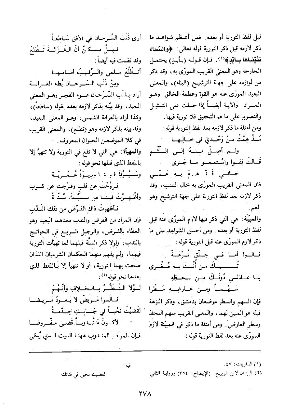 قبل لفظ التورية أَو بعده فَمن أعظم شَوَاهِد مَا ذكر لَازمه قبل ذكره التورية قَوْله تَعَالَى: {وَالسَّمَاء بنيناها بأيد} فَإِن قَوْله (بأيد) يحْتَمل الْجَارِحَة وَهُوَ الْمَعْنى الْقَرِيب المورى بِهِ، وَقد ذكر من لوزامه على جِهَة الترشيح (الْبناء) ، وَالْمعْنَى الْبعيد المورى عَنهُ هُوَ الْقُوَّة وعظمة الْخَالِق وَهُوَ المُرَاد وَالْآيَة أَيْضا إِذا حملت على التَّمْثِيل والتصوير على مَا هُوَ التَّحْقِيق فَلَا تورية فِيهَا