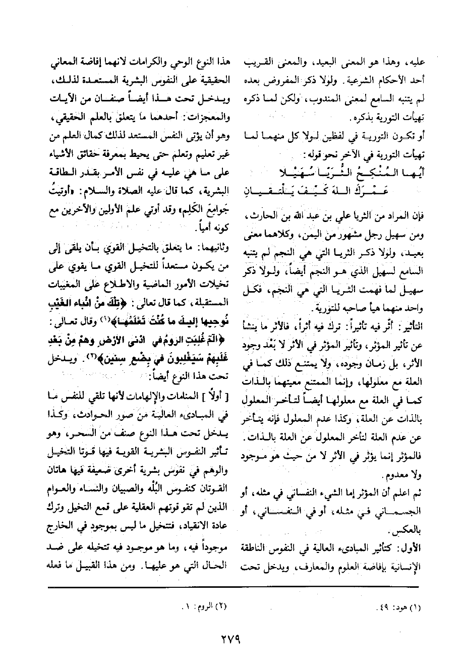وَثَانِيهمَا: مَا يتَعَلَّق بالتخيل الْقوي بِأَن يلقى إِلَى من يكون مستعدا للتخيل الْقوي مَا يُقَوي على تخيلات الْأُمُور الْمَاضِيَة والاطلاع على المغيبات الْمُسْتَقْبلَة، كَمَا قَالَ تَعَالَى: {تِلْكَ من أنباء الْغَيْب نوحيها إِلَيْك مَا كنت تعلمهَا} وَقَالَ تَعَالَى: {الم غلبت الرّوم فِي أدنى الأَرْض وهم من بعد غلبهم سيغلبون فِي بضع سِنِين} وَيدخل تَحت هَذَا النَّوْع أَيْضا: [أَولا] المنامات والإلهامات لِأَنَّهَا تلقي للنَّفس مَا فِي المبادئ الْعَالِيَة من صور الْحَوَادِث، وَكَذَا يدْخل تَحت هَذَا النَّوْع صنف من السحر، وَهُوَ تَأْثِير النُّفُوس البشرية القوية فِيهَا قوتا التخيل وَالوهم فِي نفوس بشرية أُخْرَى ضَعِيفَة فهيا هَاتَانِ القوتان كنفوس البله وَالصبيان وَالنِّسَاء والعوام الَّذين لم تقو قوتهم الْعَقْلِيَّة على قمع التخيل وَترك عَادَة الانقياد، فتتخيل مَا لَيْسَ بموجود فِي الْخَارِج