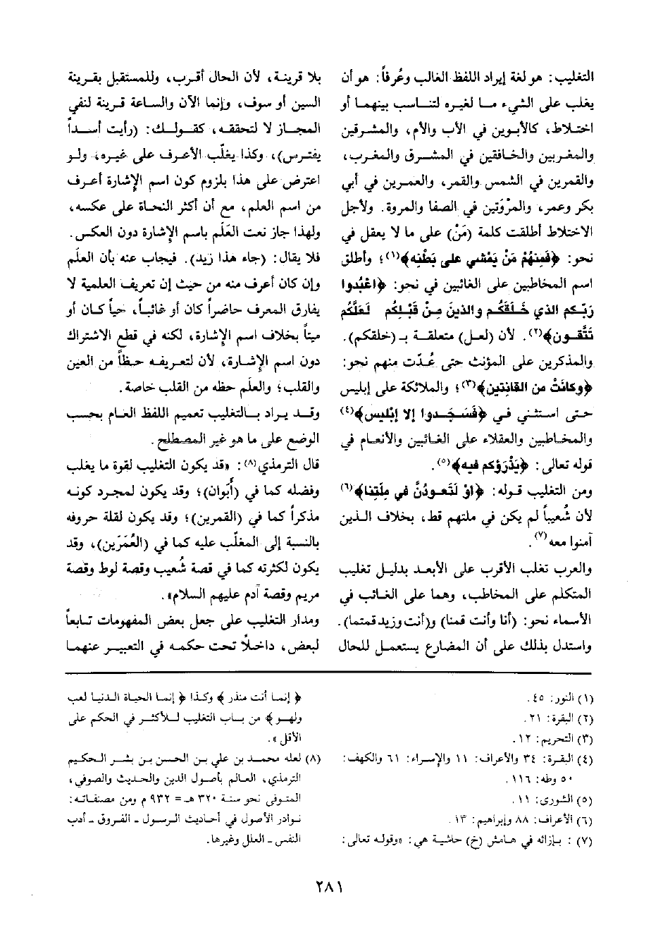 التغليب: هُوَ لُغَة إِيرَاد اللَّفْظ الْغَالِب وَعرفا: هُوَ أَن يغلب على الشَّيْء مَا لغيره لتناسب بَينهمَا أَو اخْتِلَاط، كالأبوين فِي الْأَب وَالأُم، والمشرقين والمغربين والخافقين فِي الْمشرق وَالْمغْرب، والقمرين فِي الشَّمْس وَالْقَمَر، والعمرين فِي أبي بكر وَعمر، والمروتين فِي الصَّفَا والمروة وَلأَجل الِاخْتِلَاط أطلقت كلمة (من) على مَا لَا يعقل فِي نَحْو: {فَمنهمْ من يمشي على بَطْنه} ؛ وَأطلق اسْم المخاطبين على الغائبين فِي نَحْو: {اعبدوا ربكُم الَّذِي خَلقكُم وَالَّذين من قبلكُمْ لَعَلَّكُمْ تَتَّقُون} لِأَن (لَعَلَّ) مُتَعَلقَة ب (خَلقكُم)