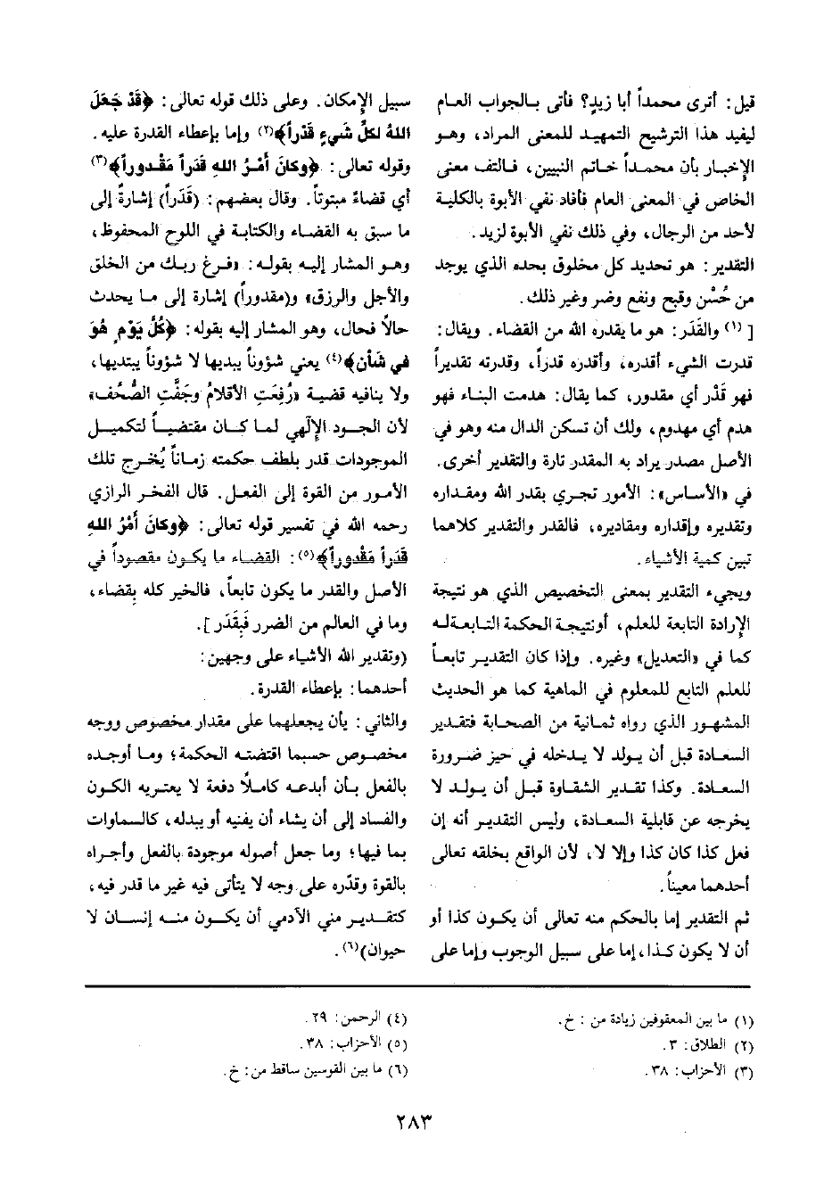 وَقَوله تَعَالَى: {وَكَانَ أَمر الله قدرا مَقْدُورًا} أَي قَضَاء مبتوتا وَقَالَ بَعضهم: (قدرا) إِشَارَة إِلَى مَا سبق بِهِ الْقَضَاء وَالْكِتَابَة فِي اللَّوْح الْمَحْفُوظ، وَهُوَ الْمشَار إِلَيْهِ بقوله: " فرغ رَبك من الْخلق وَالْأَجَل والرزق " و (مَقْدُورًا) إِشَارَة إِلَى مَا يحدث حَالا فحال، وَهُوَ الْمشَار إِلَيْهِ بقوله: {كل يَوْم هُوَ فِي شَأْن} يَعْنِي شؤونا يبديها لَا شؤونا يبتديها، وَلَا يُنَافِيهِ قَضِيَّة " رفعت الأقلام وجفت الصُّحُف " لِأَن الْجُود الإلهي لما كَانَ مقتضيا لتكميل الموجودات قدر بلطف حكمته زَمَانا يخرج تِلْكَ الْأُمُور من الْقُوَّة إِلَى الْفِعْل قَالَ الْفَخر الرَّازِيّ رَحمَه الله فِي تَفْسِير قَوْله تَعَالَى: {وَكَانَ أَمر الله قدرا مَقْدُورًا} : الْقَضَاء مَا يكون مَقْصُودا فِي الأَصْل وَالْقدر مَا يكون تَابعا، فالخير كُله بِقَضَاء، وَمَا فِي الْعَالم من الضَّرَر فبقدر]