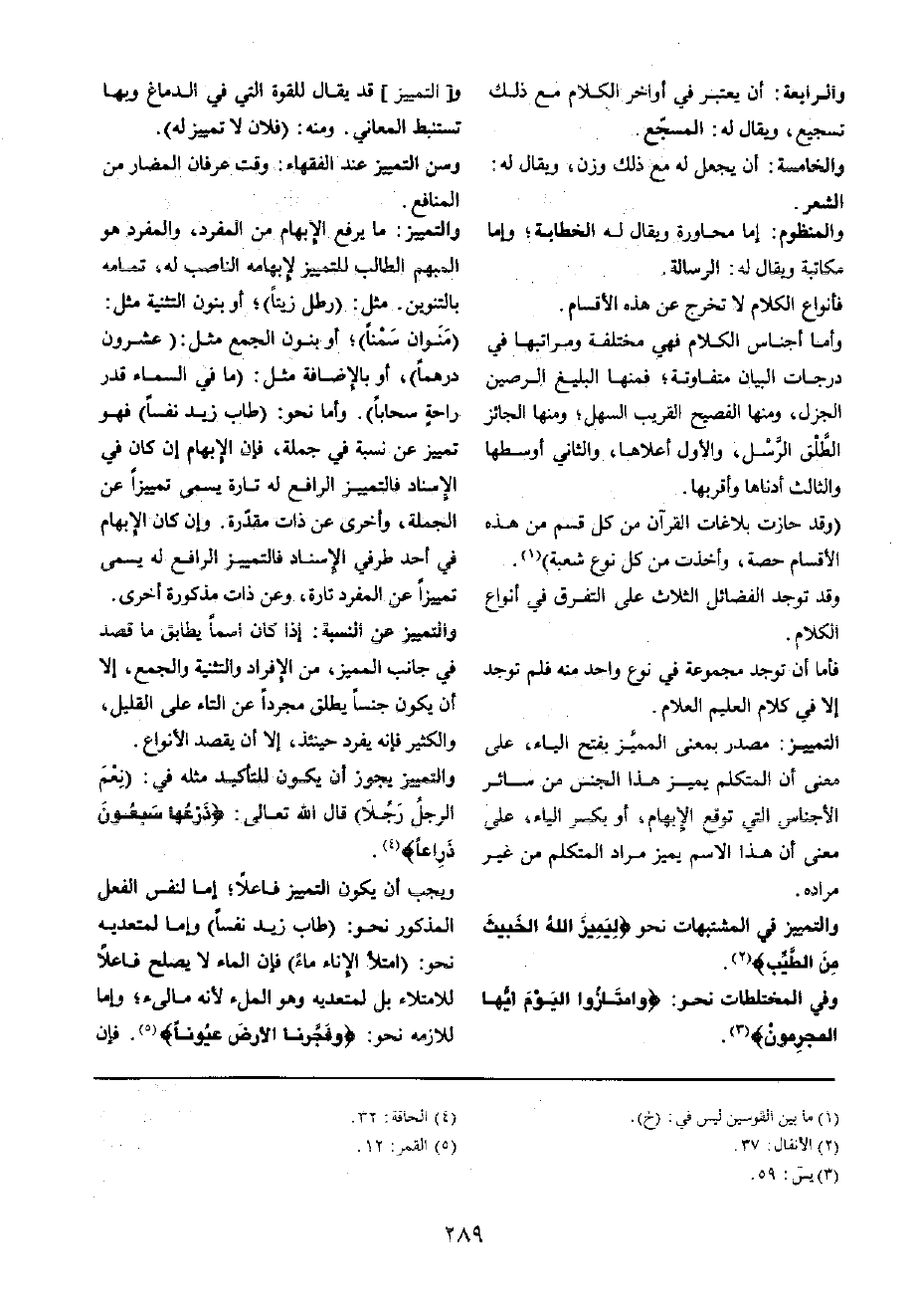 والتمييز: مَا يرفع الْإِبْهَام من الْمُفْرد، والمفرد هُوَ الْمُبْهم الطَّالِب للتمييز لإبهامه الناصب لَهُ، تَمَامه بِالتَّنْوِينِ مثل: (رَطْل زيتا) ؛ أَو بنُون التَّشْبِيه مثل: (منوان سمنا) ؛ أَو بنُون الْجمع مثل: (عشرُون درهما) ، أَو بِالْإِضَافَة مثل: (مَا فِي السَّمَاء قدر رَاحَة سحابا) وَأما نَحْو: (طَابَ زيد نفسا) فَهُوَ تَمْيِيز عَن نِسْبَة فِي جملَة، فَإِن الْإِبْهَام إِن كَانَ فِي الْإِسْنَاد فالتمييز الرافع لَهُ تَارَة يُسمى تمييزا عَن الْجُمْلَة، وَأُخْرَى عَن ذَات مقدرَة وَإِن كَانَ الْإِبْهَام فِي أحد طرفِي الْإِسْنَاد فالتمييز الرافع لَهُ يُسمى تمييزا عَن الْمُفْرد تَارَة، وَعَن ذَات مَذْكُورَة أُخْرَى