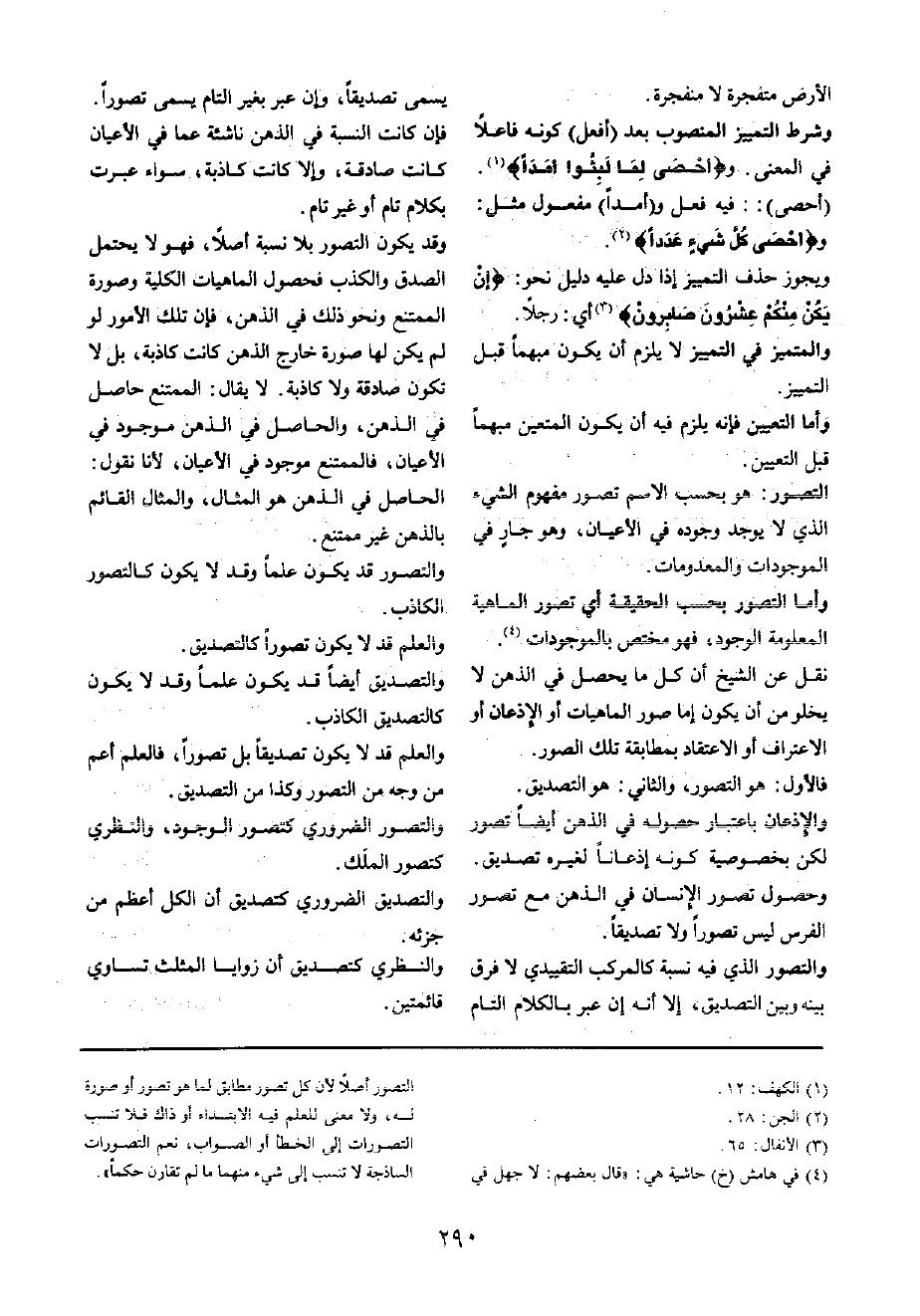 وَقد يكون التَّصَوُّر بِلَا نِسْبَة أصلا، فَهُوَ لَا يحْتَمل الصدْق وَالْكذب فحصول الماهيات الْكُلية وَصُورَة الْمُمْتَنع وَنَحْو ذَلِك فِي الذِّهْن، فَإِن تِلْكَ الْأُمُور لَو لم يكن لَهَا صُورَة خَارج الذِّهْن كَانَت كَاذِبَة، بل لَا تكون صَادِقَة وَلَا كَاذِبَة لَا يُقَال: الْمُمْتَنع حَاصِل فِي الذِّهْن، وَالْحَاصِل فِي الذِّهْن مَوْجُود فِي الْأَعْيَان، فالممتنع مَوْجُود فِي الْأَعْيَان، لأَنا نقُول: الْحَاصِل فِي الذِّهْن هُوَ الْمِثَال، والمثال الْقَائِم بالذهن غير مُمْتَنع