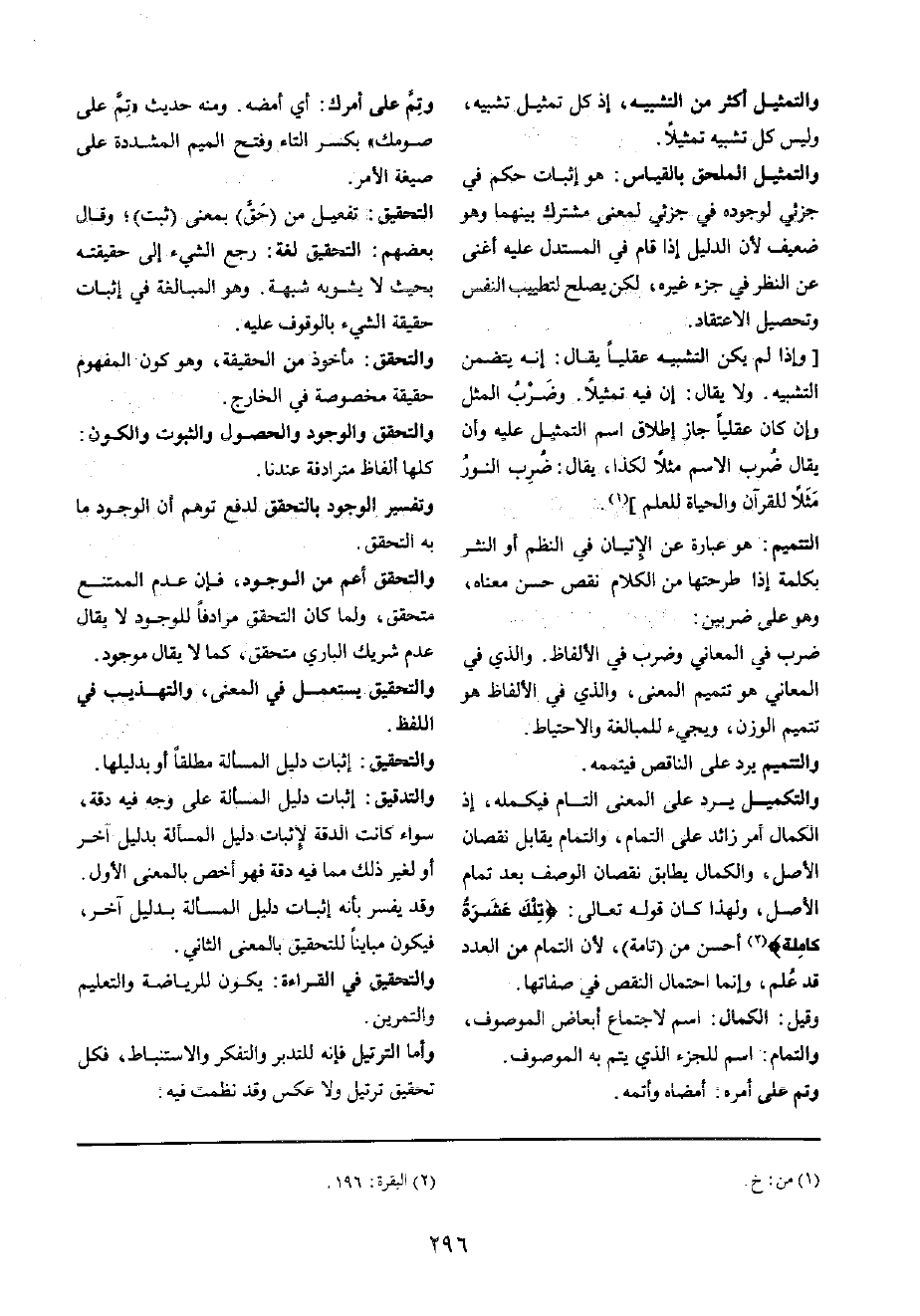 والتكميل يرد على الْمَعْنى التَّام فيكمله، إِذْ الْكَمَال أَمر زَائِد على التَّمام، والتمام يُقَابل نُقْصَان الأَصْل، والكمال يُطَابق نُقْصَان الْوَصْف بعد تَمام الأَصْل، وَلِهَذَا كَانَ قَوْله تَعَالَى: {تِلْكَ عشرَة كَامِلَة} أحسن من (تَامَّة) ، لِأَن التَّمام من الْعدَد قد علم، وَإِنَّمَا احْتِمَال النَّقْص فِي صفاتها