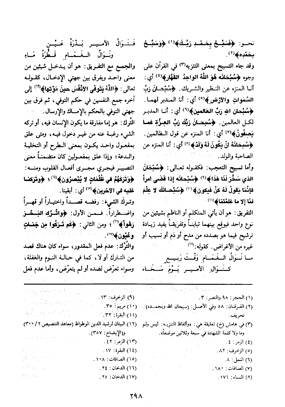 نَحْو: {سبح بِحَمْد رَبك} {وَسبح بِحَمْدِهِ} وَقد جَاءَ التَّسْبِيح بِمَعْنى التَّنْزِيه فِي الْقُرْآن على وُجُوه {سُبْحَانَهُ هُوَ الله الْوَاحِد القهار} أَي: أَنا المنزه عَن النظير وَالشَّرِيك {سُبْحَانَ رب السَّمَاوَات وَالْأَرْض} أَي: أَنا الْمُدبر لَهما