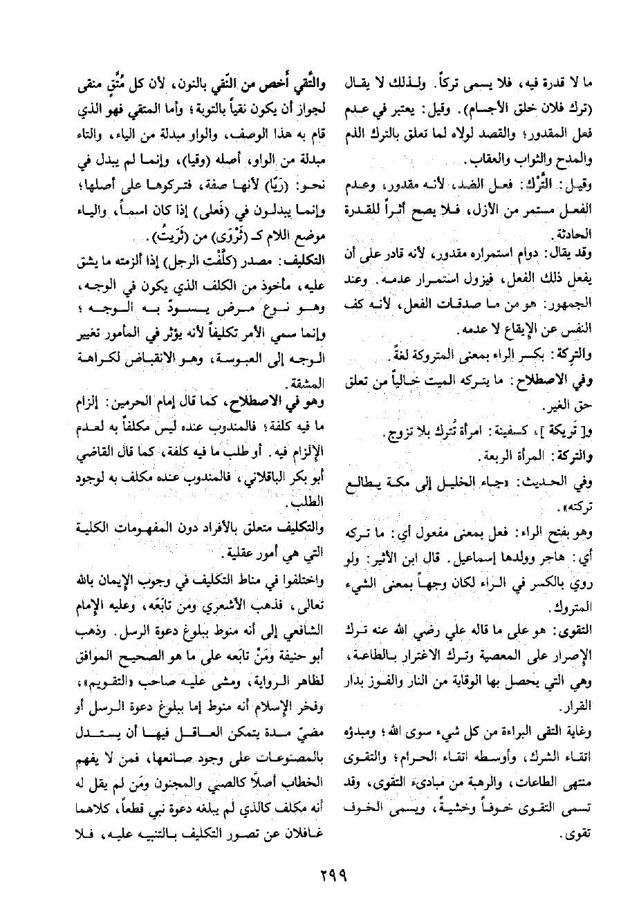 مَا لَا قدرَة فِيهِ، فَلَا يُسمى تركا وَلذَلِك لَا يُقَال (ترك فلَان خلق الْأَجْسَام) وَقيل: يعْتَبر فِي عدم فعل الْمَقْدُور؛ وَالْقَصْد لولاه لما تعلق بِالتّرْكِ الذَّم والمدح وَالثَّوَاب وَالْعِقَاب