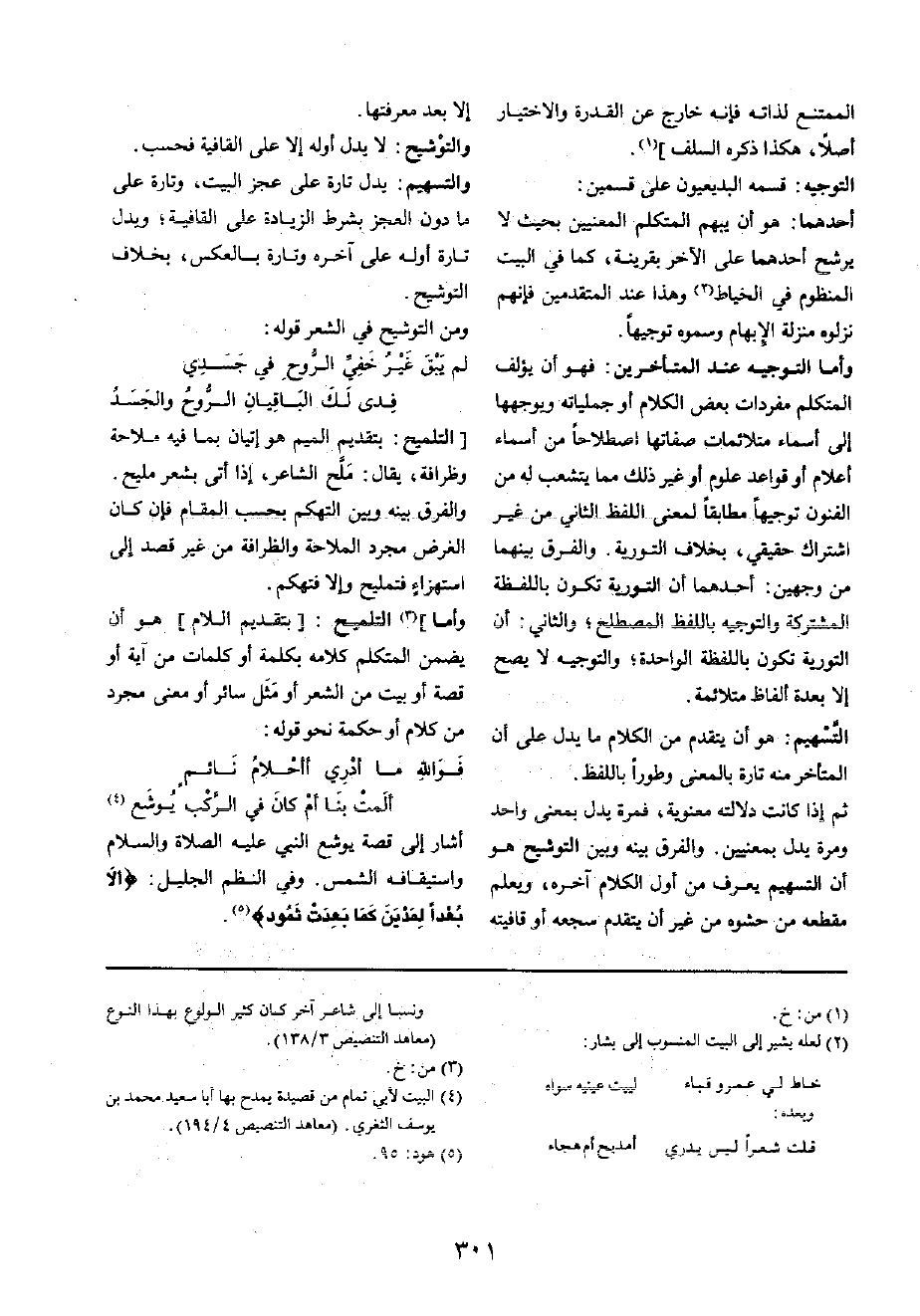 التَّوْجِيه: قسْمَة البديعيون على قسمَيْنِ: أَحدهمَا: هُوَ أَن يبهم الْمُتَكَلّم الْمَعْنيين بِحَيْثُ لَا يرشح أَحدهمَا على الآخر بِقَرِينَة، كَمَا فِي الْبَيْت المنظوم فِي الْخياط وَهَذَا عِنْد الْمُتَقَدِّمين فَإِنَّهُم نزلوه منزلَة الْإِبْهَام وسموه توجيها