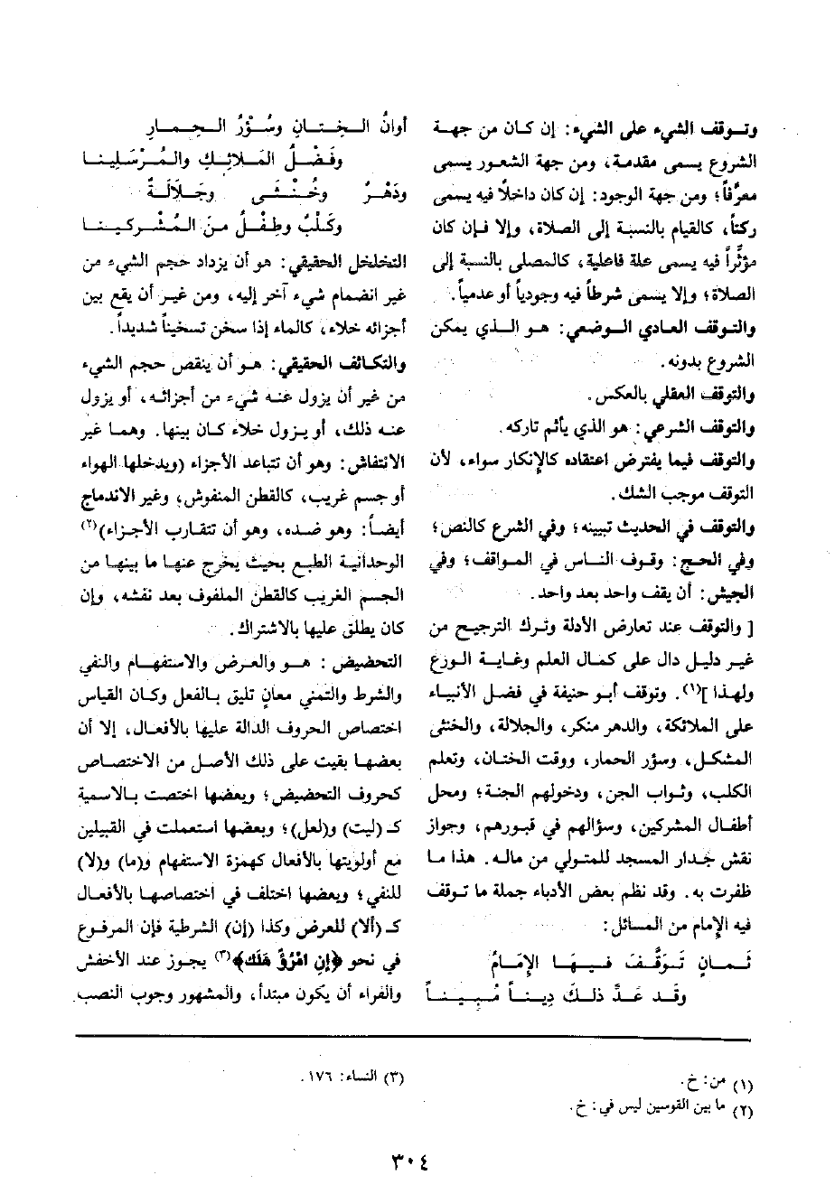 والتوقف فِي الحَدِيث تبيينه؛ وَفِي الشَّرْع كالنص؛ وَفِي الْحَج: وقُوف النَّاس فِي المواقف؛ وَفِي الْجَيْش: أَن يقف وَاحِد بعد وَاحِد [والتوقف عِنْد تعَارض الْأَدِلَّة وَترك التَّرْجِيح من غير دَلِيل دَال على كَمَال الْعلم وَغَايَة الْوَرع وَلِهَذَا] وَتوقف أَبُو حنيفَة فِي فضل الْأَنْبِيَاء على الْمَلَائِكَة، والدهر مُنكر، وَالْجَلالَة، وَالْخُنْثَى الْمُشكل، وسؤر الْحمال، وَوقت الْخِتَان، وَتعلم الْكَلْب، وثواب الْجِنّ، ودخولهم الْجنَّة؛ وَمحل أَطْفَال الْمُشْركين، وسؤالهم فِي قُبُورهم، وَجَوَاز نقش جِدَار الْمَسْجِد للمتولي من مَاله هَذَا مَا ظَفرت بِهِ وَقد نظم بعض الأدباء جملَة مَا توقف فِيهِ الإِمَام من الْمسَائِل: