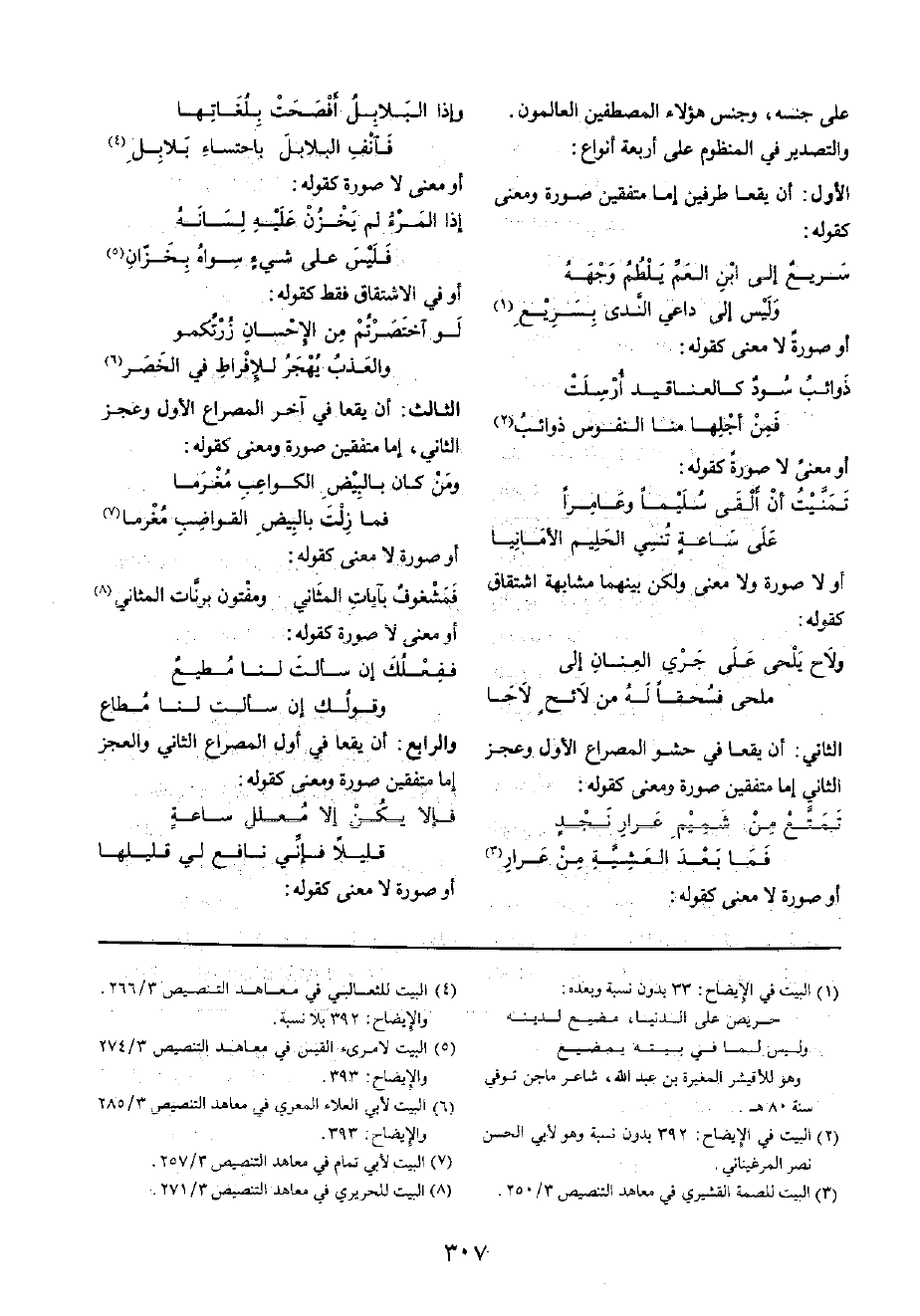 والتصدير فِي المنظوم على أَرْبَعَة أَنْوَاع: الأول: أَن يقعا طرفين إِمَّا متفقين صُورَة وَمعنى كَقَوْلِه: