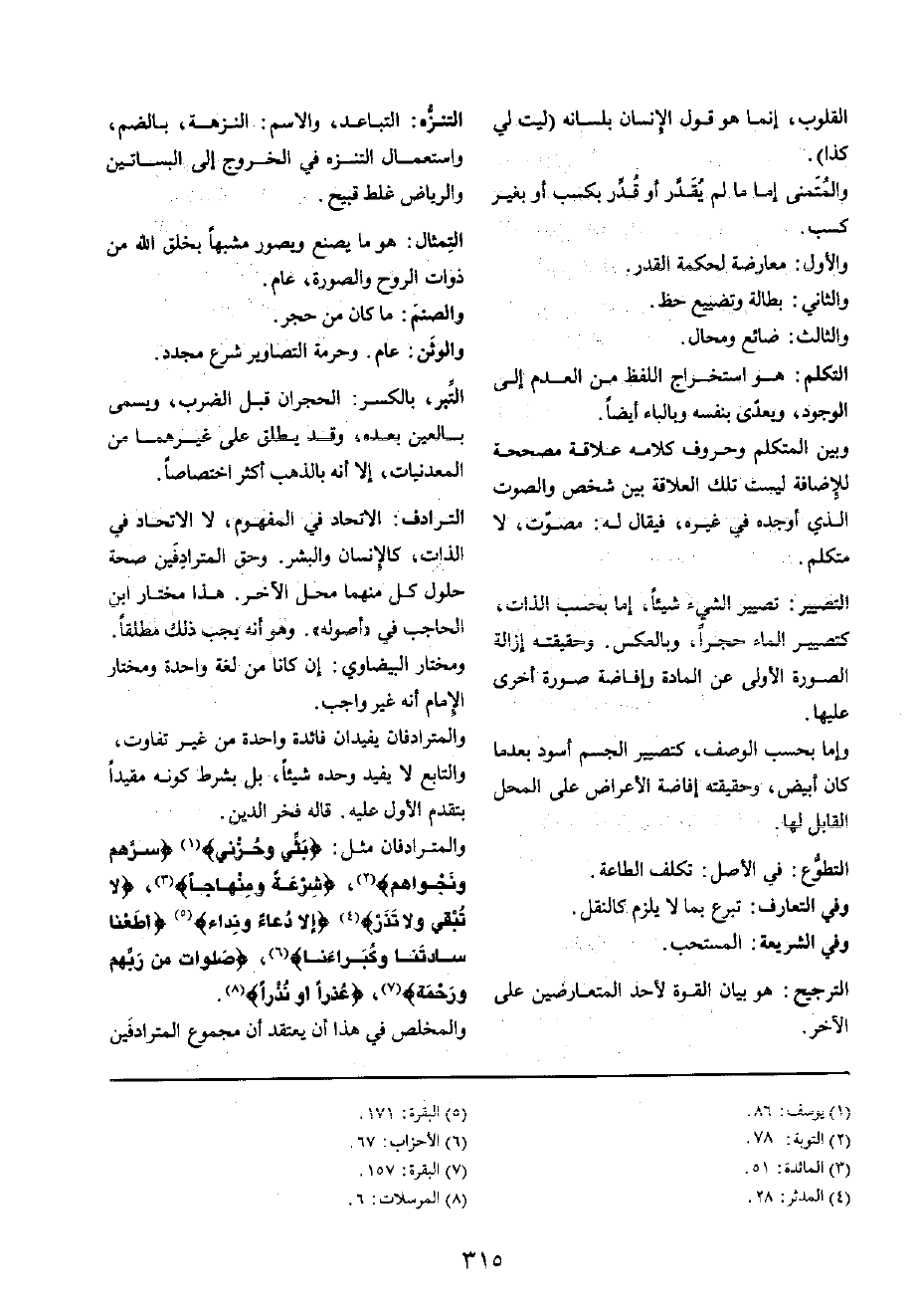 والمترادفان يفيدان فَائِدَة وَاحِدَة من غير تفَاوت، وَالتَّابِع لَا يُفِيد وَحده شَيْئا، بل بِشَرْط كَونه مُقَيّدا بتقدم الأول عَلَيْهِ قَالَه فَخر الدّين والمترادفان مثل: {بثي وحزني} {سرهم ونجواهم} ، {شرعة ومنهاجا} ، {لَا تبقي وَلَا تذر} {إِلَّا دُعَاء ونداء} {أَطعْنَا سادتنا وكبراءنا} ، {صلوَات من رَبهم وَرَحْمَة} ، {عذرا أَو نذرا}