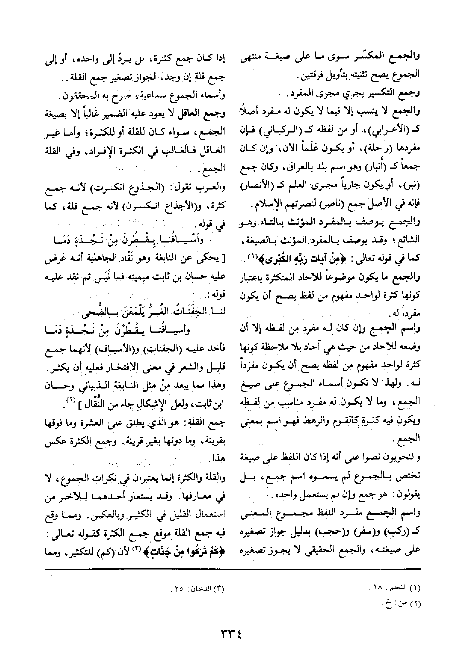 والقلة وَالْكَثْرَة إِنَّمَا يعتبران فِي نكرات الجموع، لَا فِي معارفها وَقد يستعار أَحدهمَا للْآخر من اسْتِعْمَال الْقَلِيل فِي الْكثير وَبِالْعَكْسِ وَمِمَّا وَقع فِيهِ جمع الْقلَّة موقع جمع الْكَثْرَة كَقَوْلِه تَعَالَى: {كم تركُوا من جنَّات} لِأَن (كم) للتكثير، وَمِمَّا
