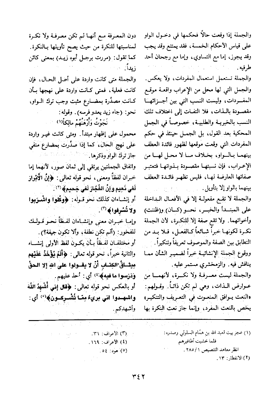 وَالْجُمْلَة لَا تقع مفعولة إِلَّا فِي الْأَفْعَال الدَّاخِلَة على الْمُبْتَدَأ وَالْخَبَر، نَحْو (كَانَ) و (ظَنَنْت) وأخواتهما وَلَا تقع صفة إِلَّا للنكرة، لِأَن الْجُمْلَة نكرَة لكَونهَا خَبرا شَائِعا كالفعل، فَلَا بُد من التطابق بَين الصّفة والموصوف تعريفا وتنكيرا