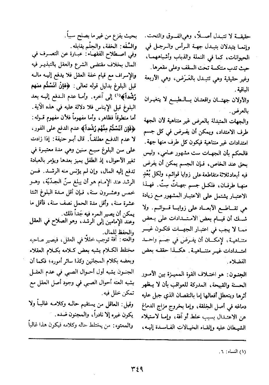 أما منطوقا فَظَاهر، وَأما مفهوما فَلِأَن مَفْهُوم قَوْله: {فَإِن آنستم مِنْهُم رشدا} عدم الدّفع على الْفَوْر، لَا عدم الدّفع مُطلقًا قَالَ أَبُو حنيفَة: إِذا زَادَت على سنّ الْبلُوغ سبع سِنِين وَهِي مُدَّة مُعْتَبرَة فِي تغير الْأَحْوَال، إِذْ الطِّفْل يُمَيّز بعْدهَا وَيُؤمر بِالْعبَادَة تدفع إِلَيْهِ المَال، وَإِن لم يؤنس مِنْهُ الرشد فسن الرشد عِنْد الإِمَام هُوَ أَن يبلغ سنّ الجدية، وَهُوَ خمس وَعِشْرُونَ سنة، فَإِن أقل مُدَّة الْبلُوغ اثْنَتَا عشرَة سنة، وَأَقل مُدَّة الْحمل نصف سنة، فَأَقل مَا يُمكن أَن يصير الْمَرْء فِيهِ جدا ذَلِك